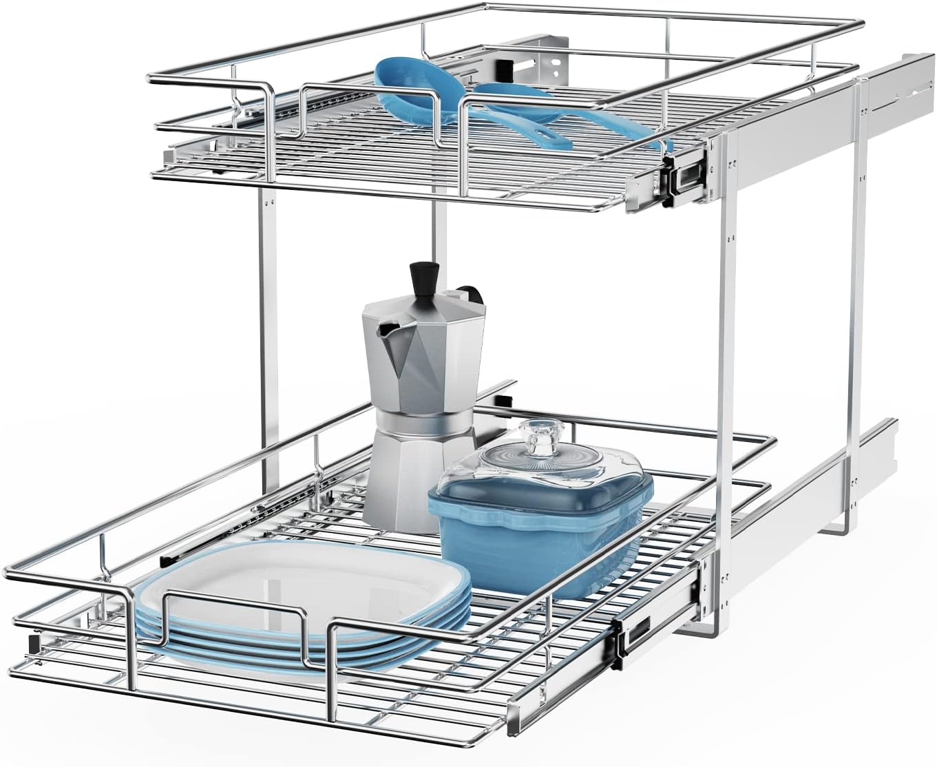 - 【Space-saving Pull Out Cabinet Organizer】This slide out cabinet organizer can maximize your cabinet space. Makes it super easy to store, organize, and access your stand mixers, pots, pans, baking sheets and other kitchen accessories, cleaning supplies, and various odds and ends. Now your cabinet is no longer just stacks of potspans.