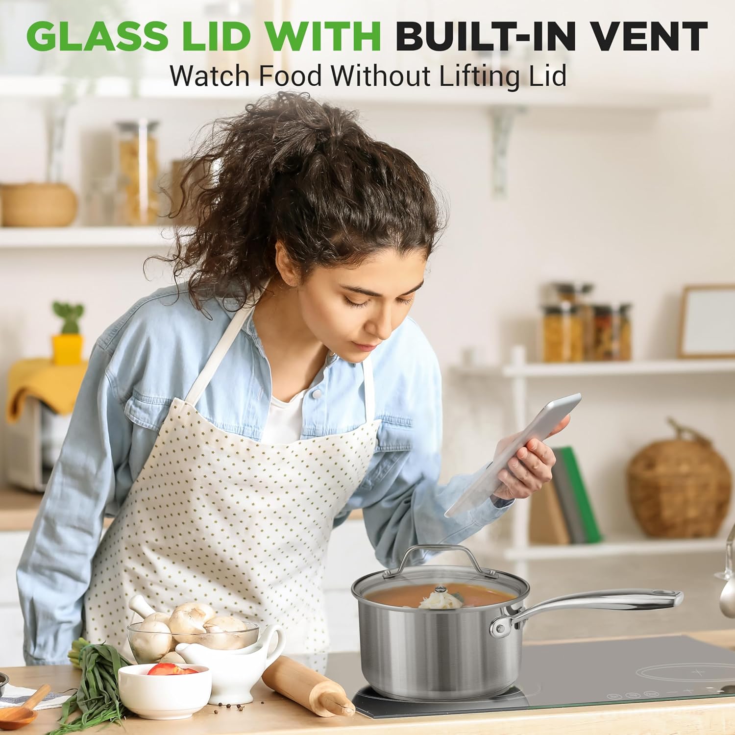 - 2 QUARTS: The Stainless Steel Saucepan features 2-quart capacity with a tempered glass lid which is the perfect size for boiling eggs, cooking noodles, simmering stocks, and soups or making sauces. Perfect for home cooking