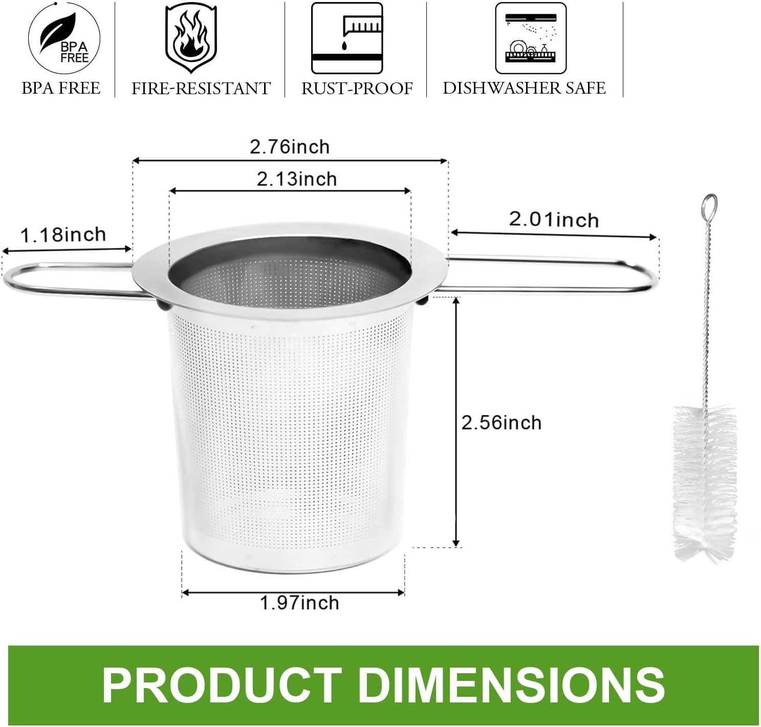 - EXTRA FINE MESH DESIGN: Tea strainers for loose tea consist of ultra-fine mesh; 6000 evenly distributed mesh holes with a diameter of about 0.007 inches that can easily block small tea leaves so that there are no tiny particles outside the tea strainer; Let loose leaf tea in hot water, rapid and sufficient expansion without affecting the aroma of the tea; It can be used to filter black tea, rooibos tea, green tea, scented tea, etc.