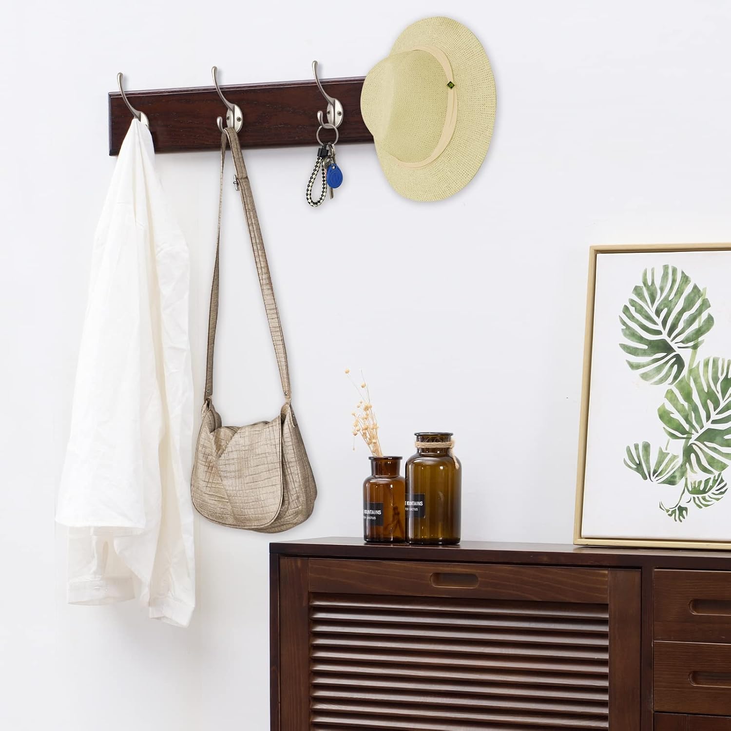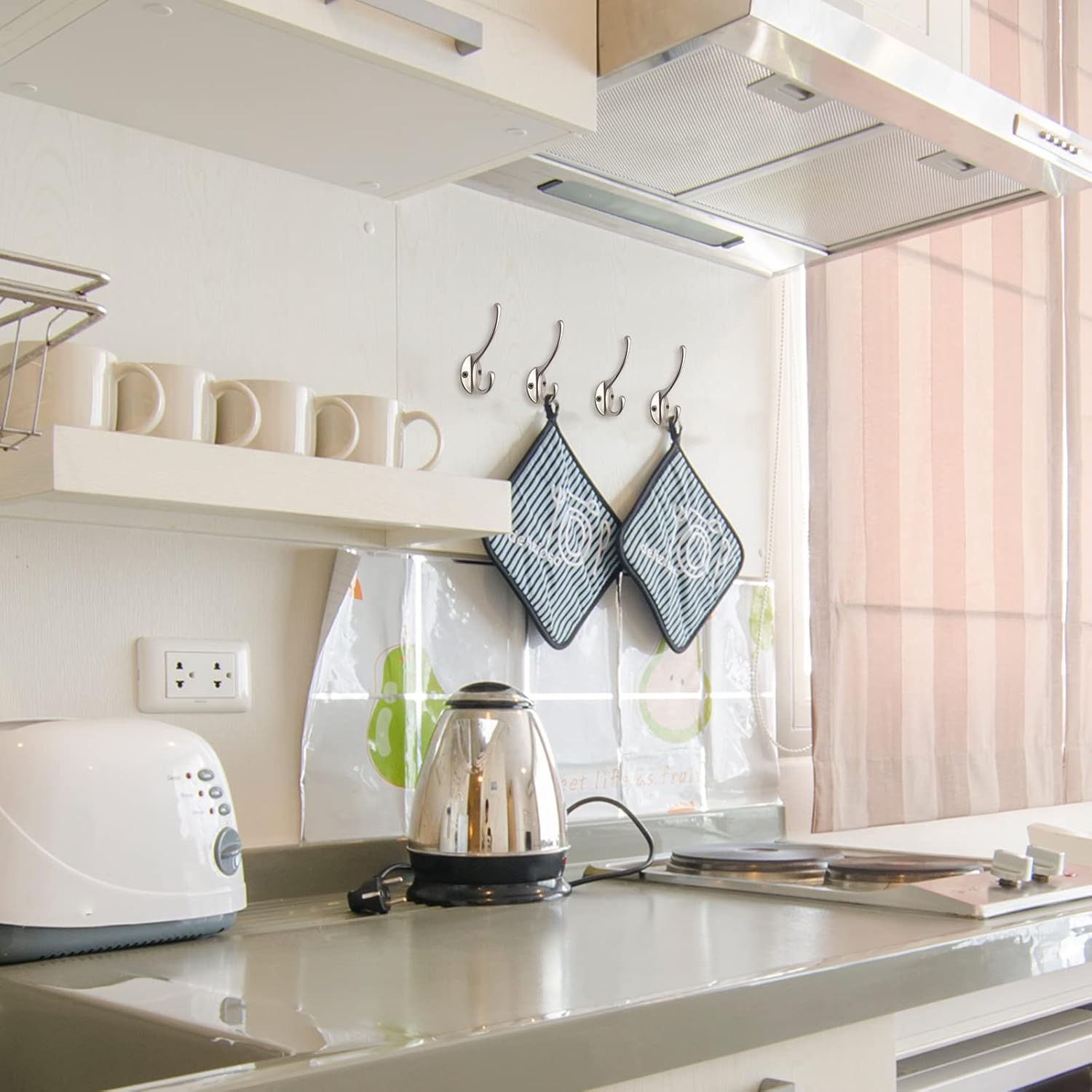 - High Quality Material:These heavy duty dual prong hooks are made of good quality zinc die cast material, the screws are made of iron, no rust, it can easily hold up to 35 lbs of weight. Hard and sturdy, can widely support coat, scarf, umbrella, bag, towel, key, hat, cup as well as Christmas socks and Christmas wreath