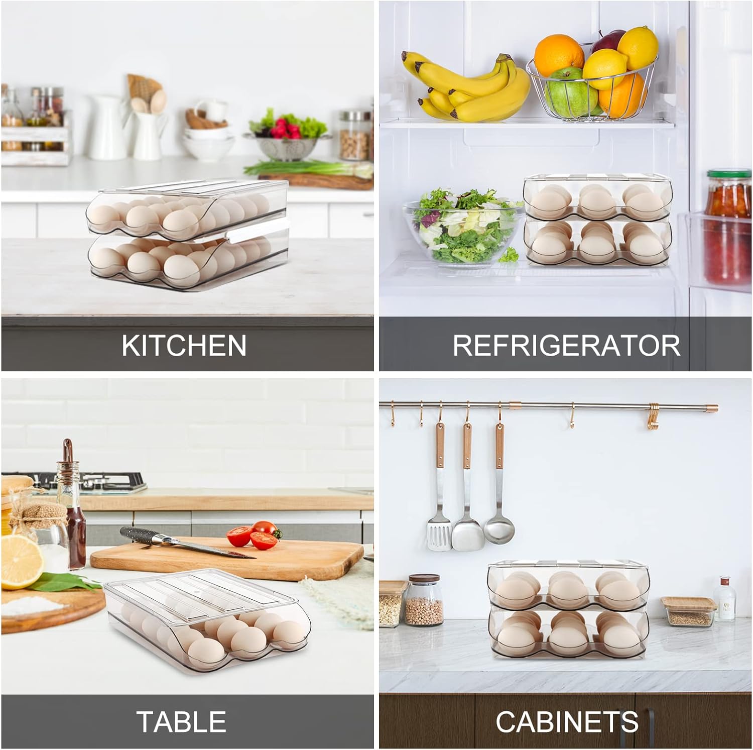 Egg Holder for Fridge,Automatically Rolling Egg Storage Container for Refrigerator,Egg Organizer for Fridge with Lid,Clear Plastic Dispenser, Tray & Box -3 Layer