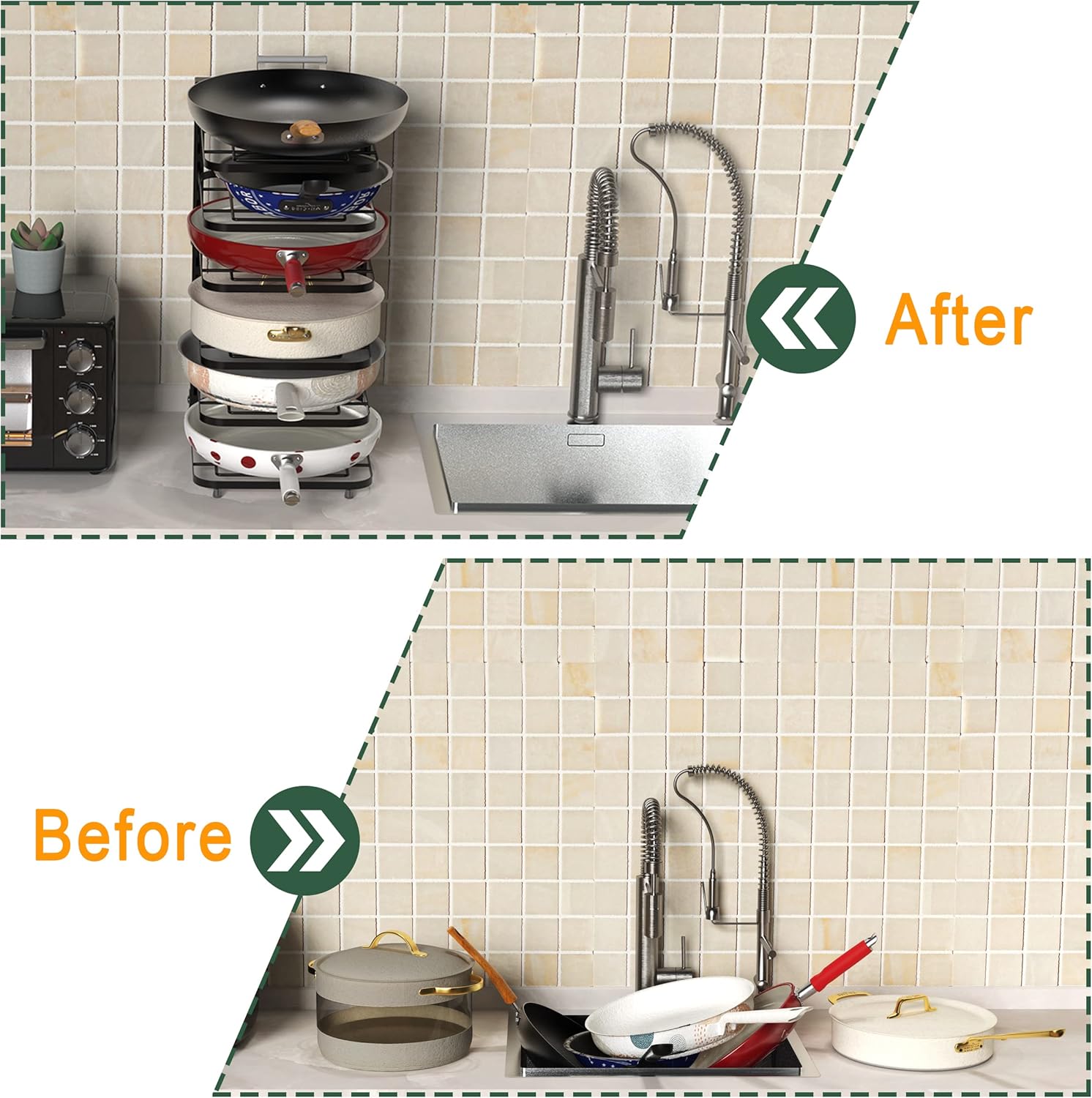 - 【Space Saving】6 layers of pan racks, large storage capacity, reduce the clutter of countertops and cabinets, make the kitchen neat and organized