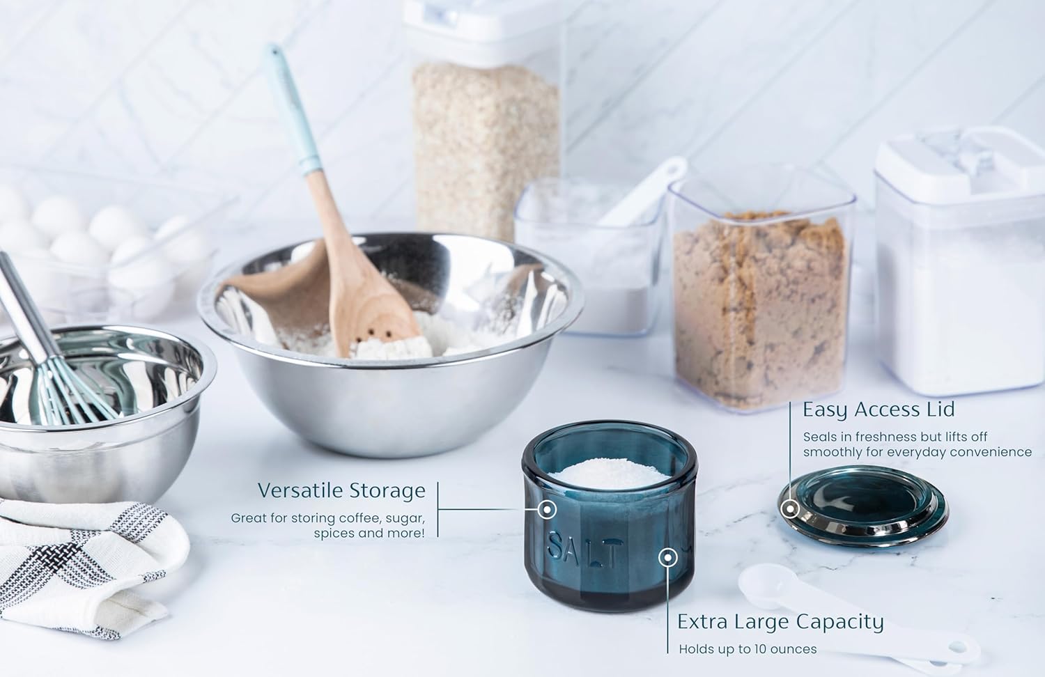 KooK Glass Salt Cellar, with Lid, Embossed Pressed Glass, Clear Storage Container, for Coffee, Sugar, Spices and Candies, Hand Wash Only, 10 oz, (Navy Blue)