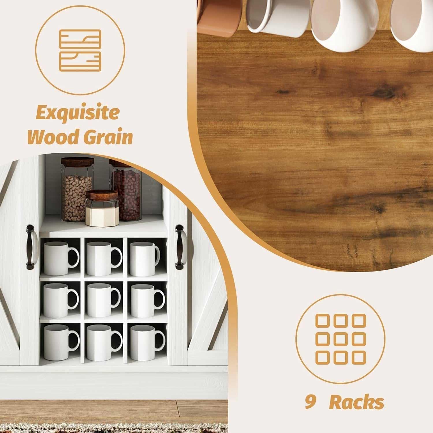 - [Farmhouse & Classic Coffee Bar]: This coffee bar cabinet features X-shaped sliding barn doors that can be positioned at the center or either side for a symmetrical look. Its classic white and wood-grain finish embodies modern farmhouse style