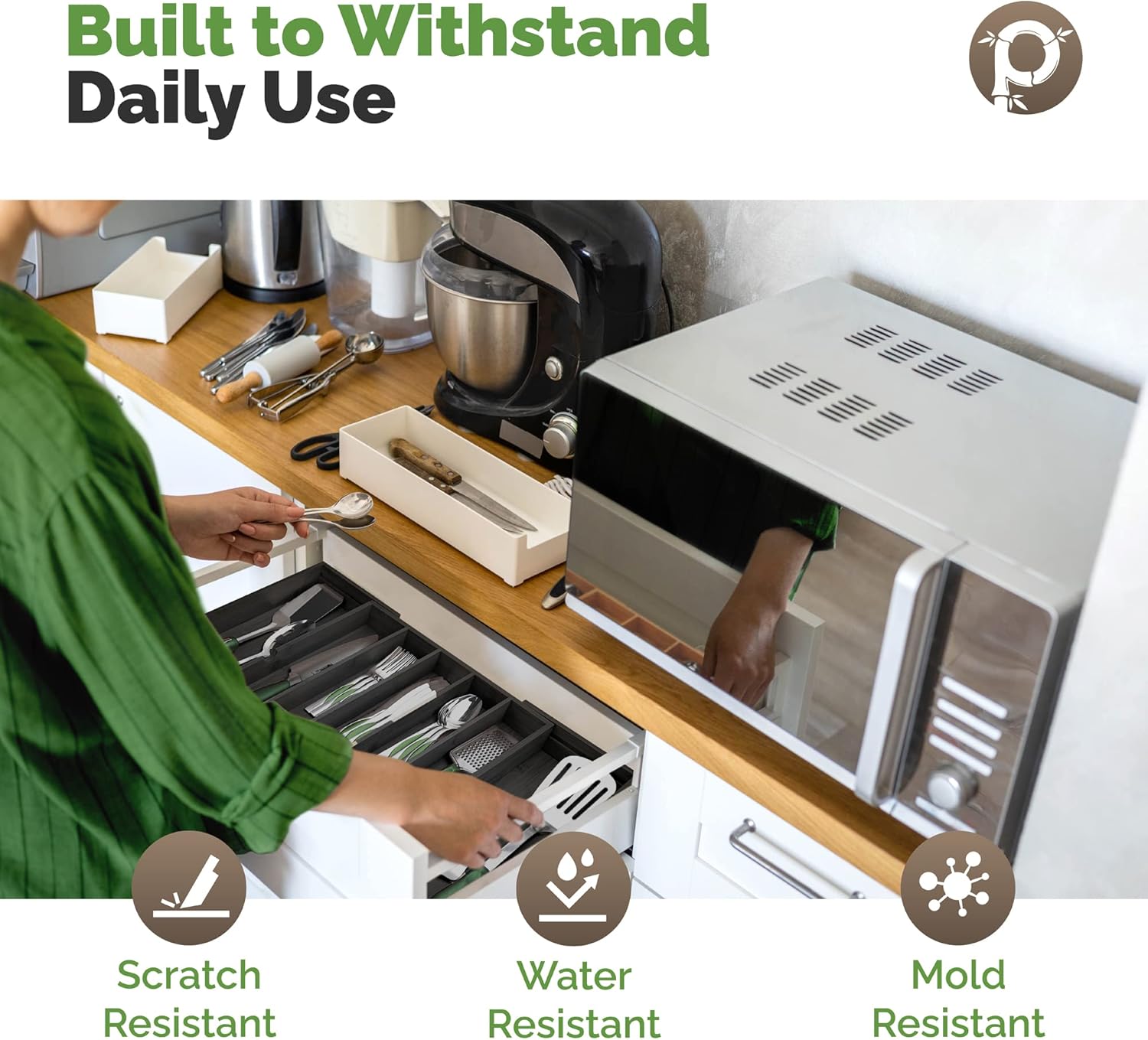 - STURDY DISTINCTIVE DESIGN: Equipped with a smart-locking mechanism and a reinforced base, our cutlery drawer organizer for kitchen is adjustable, easy-to-use and won’t slide around. Adds a beautiful touch to any kitchen decor.