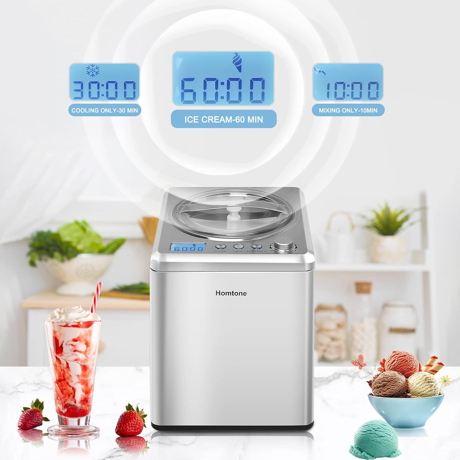 - 【One-Button Operation, Enjoy Delicious Easily】:The Homtone ice cream maker comes with an intuitive LCD screen, simple buttons and auto-shut-off function. Just add the ingredients, lock the lid and press the button. No pre-freezing of ingredients is needed, and the process is fully automatic. The digital display monitors progress in real time, and an alarm reminds you when it’s done. It’s easy for both newbies and professionals to use.