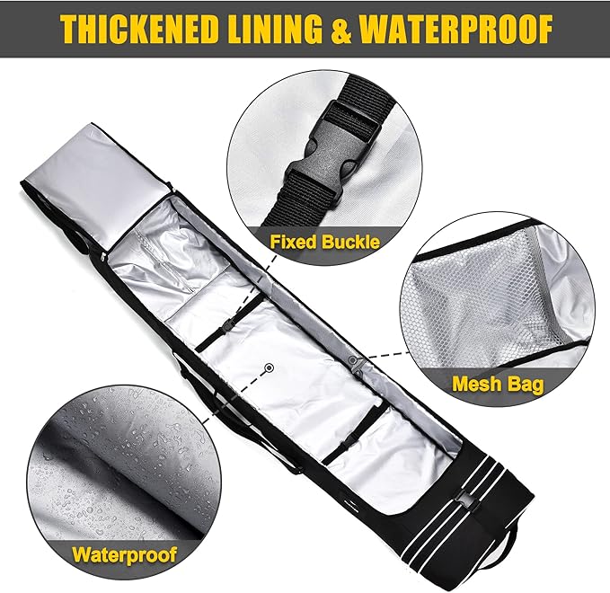 • ✨PREMIUM MATERIAL:Snowboard bag made of 600D heavy-duty oxford fabric,0.63"sponge layer and water resistant coating layer constitute, durable, thickened,waterproof,wear-resistant.Snowboard bag with wheels interior is fully surrounded by 210D water resistant lining,ensure the safety of the snowboards during transport.
