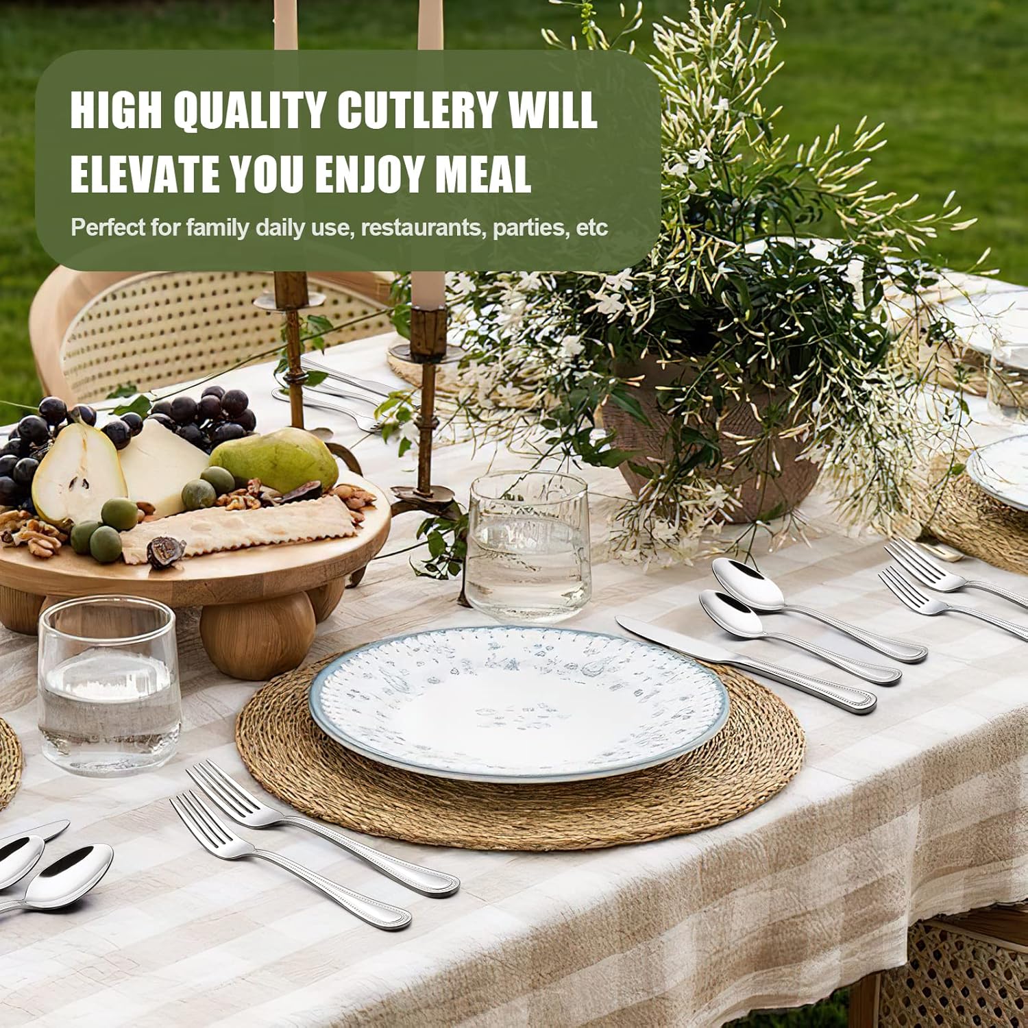 - 【ADD ELEGANCE TO TABLE】This cutlery set is a nice compromise between modern and classic thanks to its sleek, simple beaded design and bright mirror finish. Whether your style is traditional or modern,this flatware will complement your decor and never look dated. The elegant utensil set is perfect for family daily use, parties, family dinner, wedding, hotel, restaurant, formal dinner, etc.