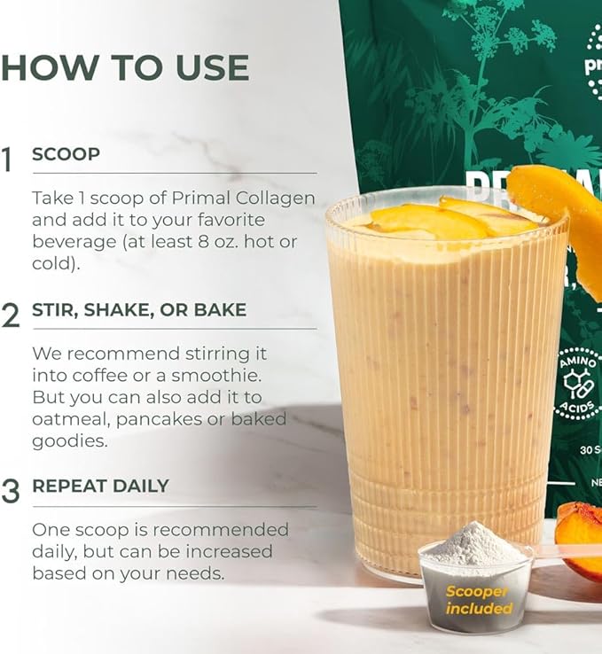 • Recommended Dosage: Stir one scoop of collagen powder into an 8oz beverage or smoothie of your choice; drink once daily & combine with balanced meals, exercise, water, & plenty of rest
