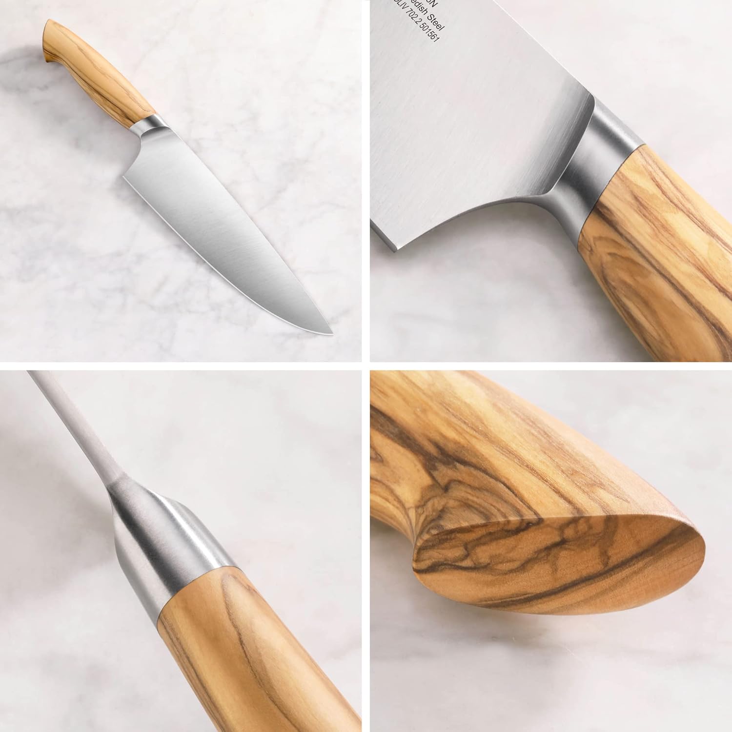 - Features robust handles, crafted from solid olive wood with a stunning wood grain, making every knife unique.