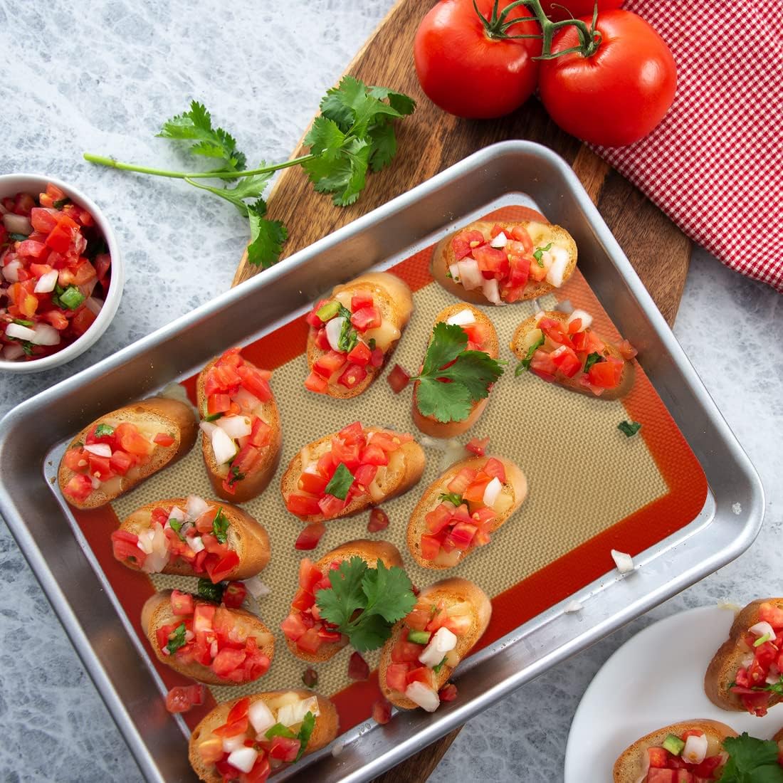- 【FOOD GRADE MATERIALS, SAFE & HEALTHY】Not need parchment paper any more. Premium liquid silicone & reinforced fiberglass contribute to the high quality of AMYONE quarter sheet mats. Non-toxic and BPA free. Can be used with oven trays or biscuit sheets to improve overall heat distribution and air circulation to achieve uniform and consistent results without scorching or cooking spots.