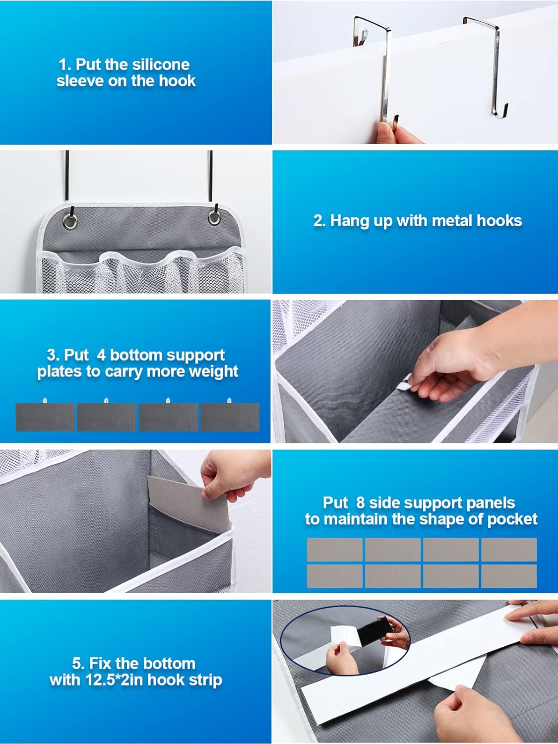 - Tool-free Assembly - Our 5-Shelf over the door organizer is easy to install in 3 simple steps. Simply by hanging the hook on the door, hanging the organizer onto the hooks, and inserting the side and bottom cardboards. We're definite that the size and the capacity of this behind door hanging storage are exactly what your family needs, 2 large exclusive steel hooks are adjustable better for your standard home size doors