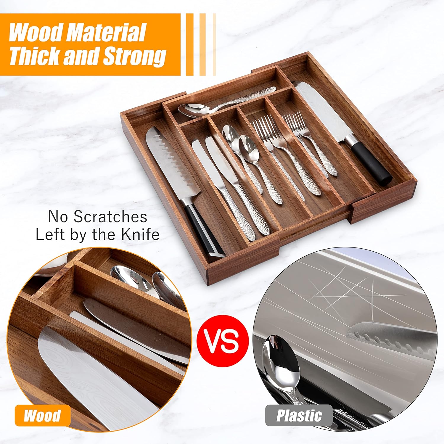 - ✅【Fit your drawer perfectly】Still measuring every kitchen drawer and buying a kitchen drawer organizer of the same size? Our bamboo silverware drawer organizer is designed with 5-7 compartments. Thanks to its adjustable features, our expandable drawer organizer can be expanded from 10 to 15 inch wide, Perfect for any kitchen drawers.