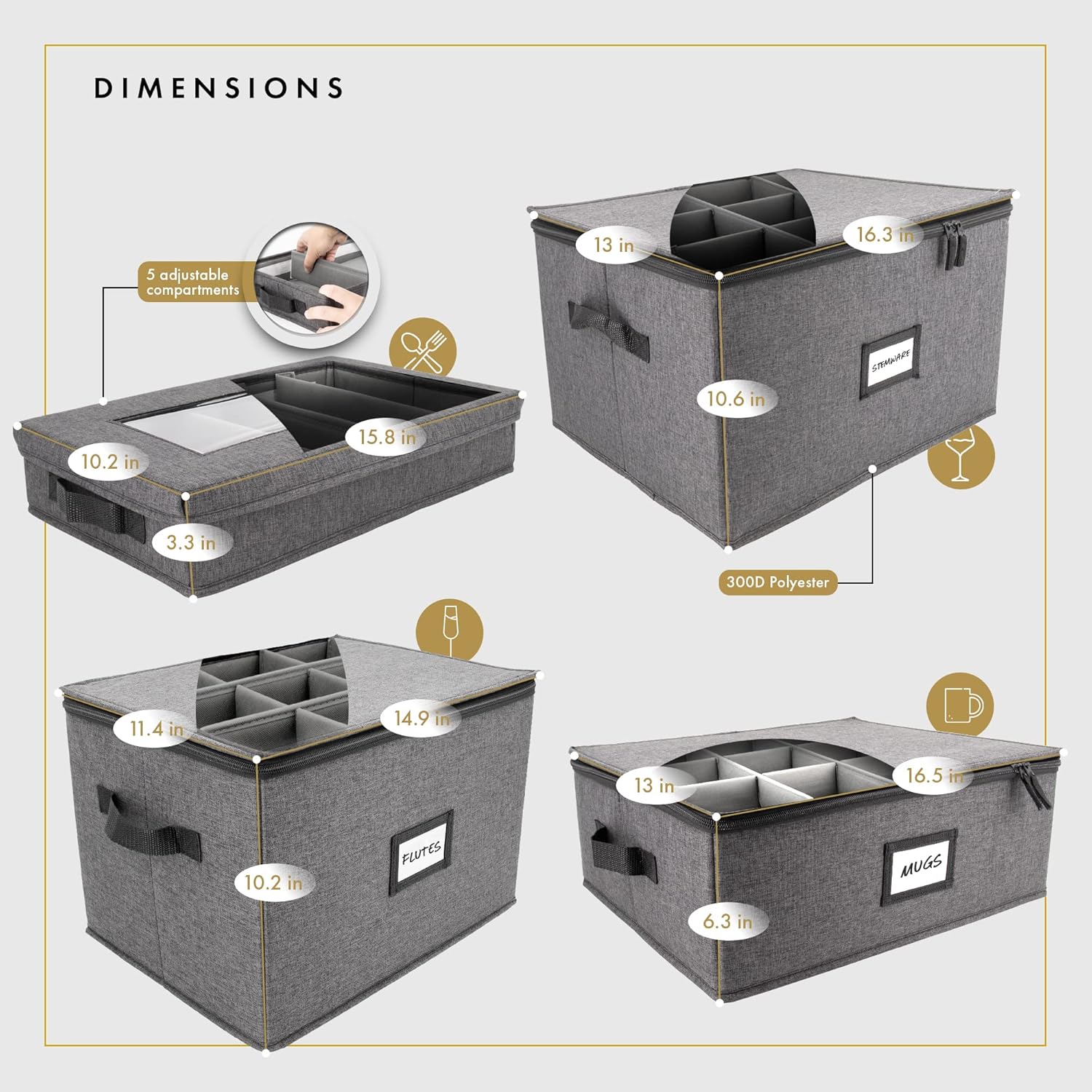 - ๐๐จ๐ฆ๐ฉ๐ซ๐๐ก๐๐ง๐ฌ๐ข๐ฏ๐ ๐๐ก๐๐ฆ๐ฉ๐๐ ๐ง๐ ๐ ๐ฅ๐ฎ๐ญ๐ ๐๐ฅ๐๐ฌ๐ฌ ๐๐ญ๐จ๐ซ๐๐ ๐: Crafted with precision, our champagne flute storage are the durable solution to your champagne glass & stemwares. This champagne glasses storage box has 14.5โLx11โWx10โH dimension with 12 adjustable 3.5โx3.5โ compartments, providing optimal protection for your drinkwares. Preserve the quality of your precious champagne flute glass collection with this fine china storage solution with 2 sturdy handles.