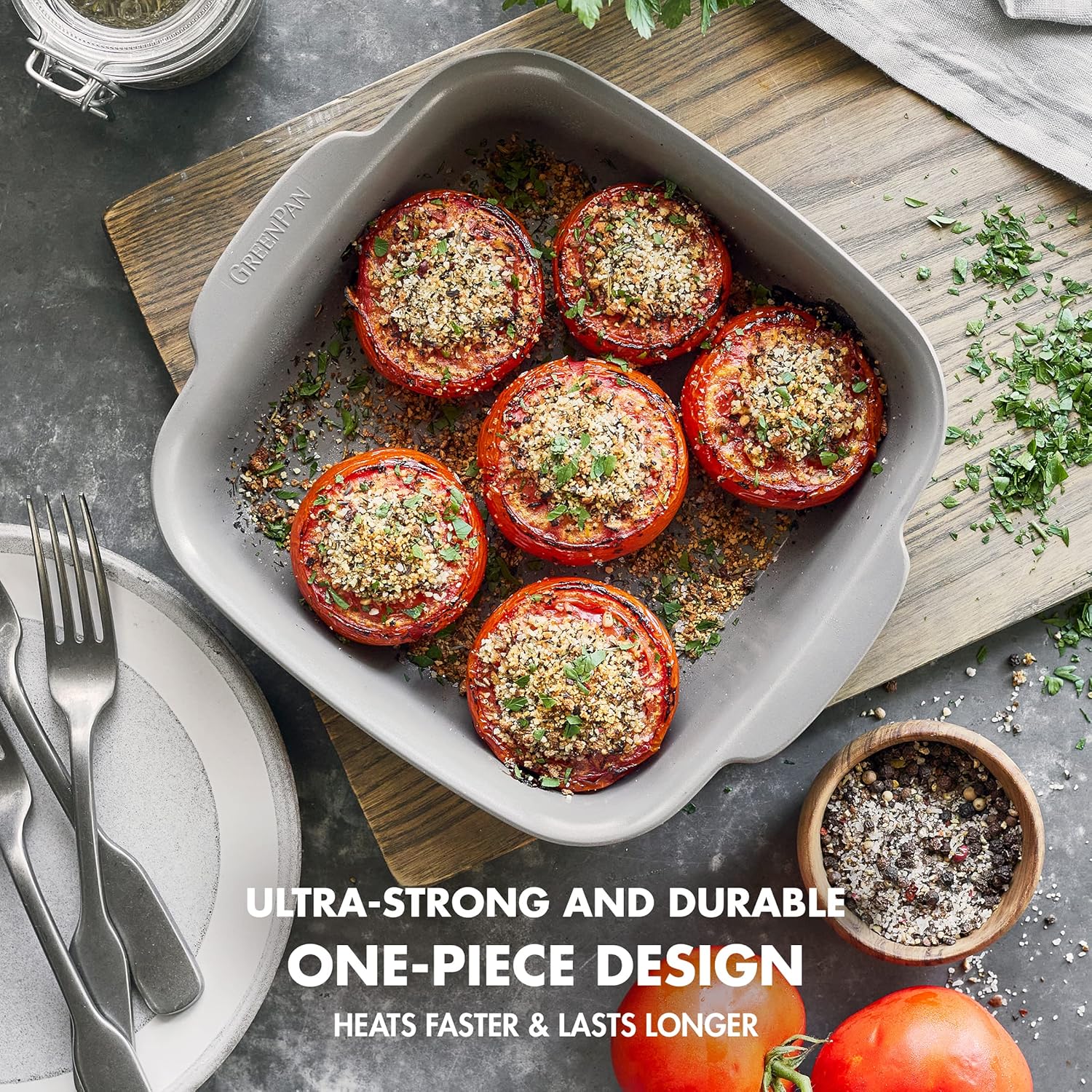 GreenPan Premiere Ovenware Healthy Ceramic Nonstick 8" Square Cake Baking Pan, Cast Aluminum Bakeware, Warp-Free, Oven and Broiler safe to 600F, Dishwasher Safe, PFAS-Free, Gray