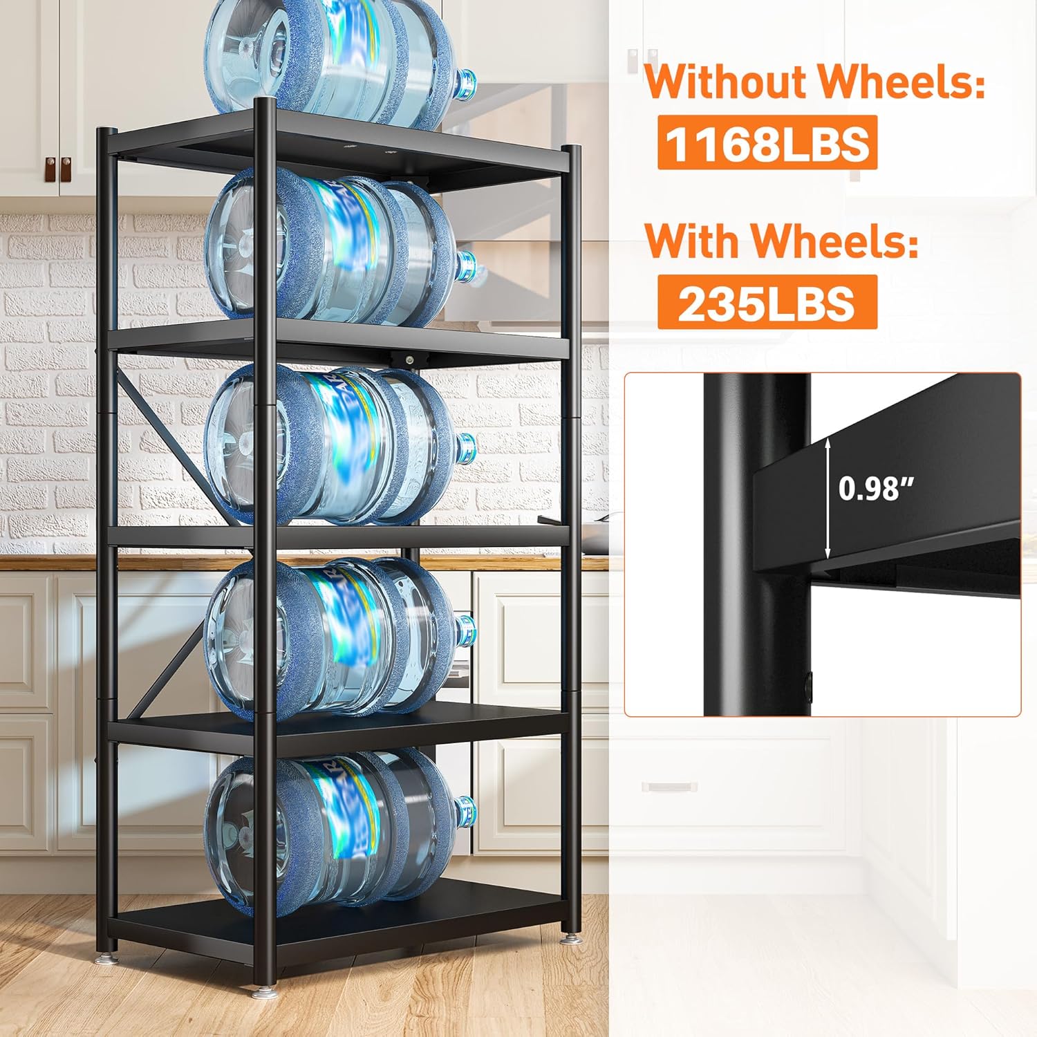 - 【Sturdy & Durable & Rust-Proof Storage Shelving】The heavy duty storage shelf is made of four metal round tubes with a diameter of 1 inch and five layers of 1.4 inch metal laminates. The overall metal shelf is solid and durable, and the material is waterproof and rust-proof and suitable for long-term use
