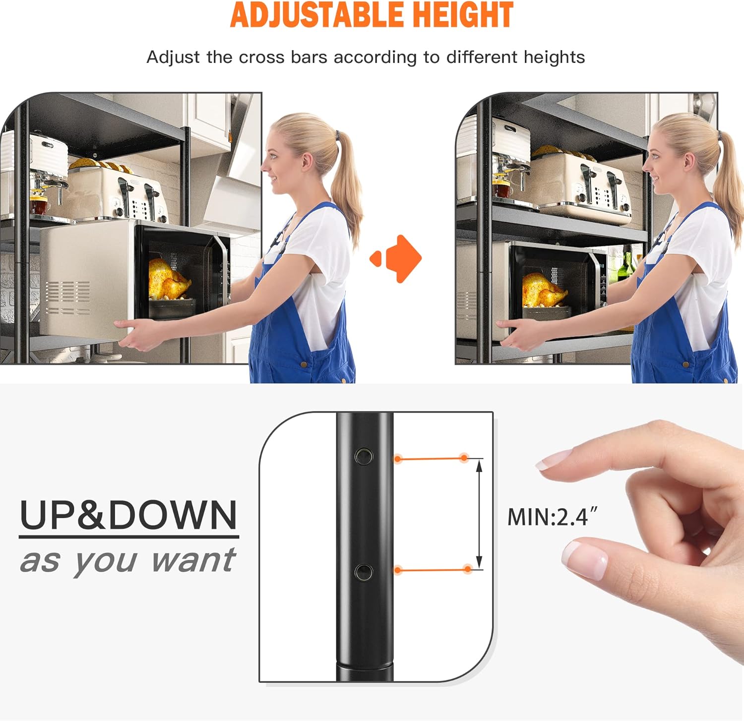 - 【Adjustable Storage Board & Replaceable Wheel】The shelving units and storage can be adjusted up and down except for the top layer ( adjustable height range of each storage board is 2.4-4.8inch). There are wall anchors and the wheels available, if you choose not to use the wheels, you can just install wall anchors