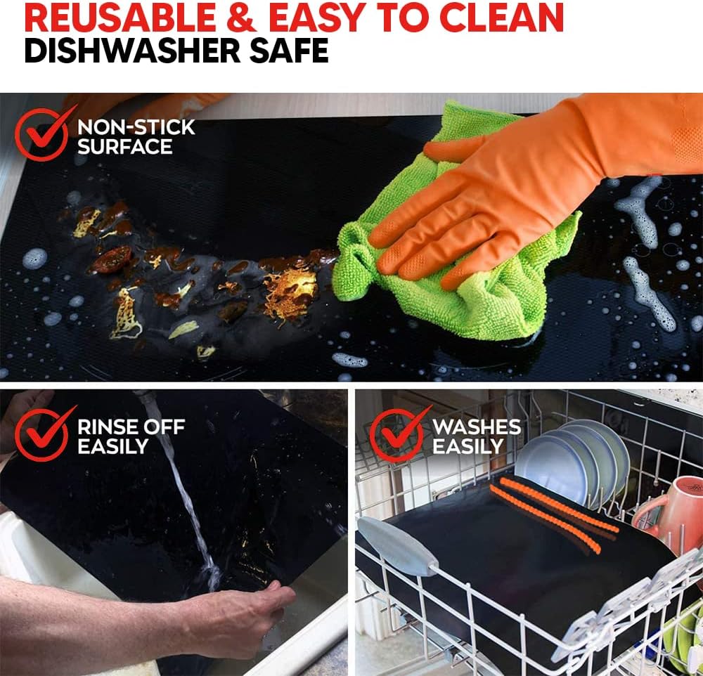 - VERY DURABLE, REUSABLE & DISHWASHER SAFE: Both the oven liner and the oven rack protector are removable and can be used over and over. They are made to last. Very easy to clean. Simply, wipe them off or wash with water.