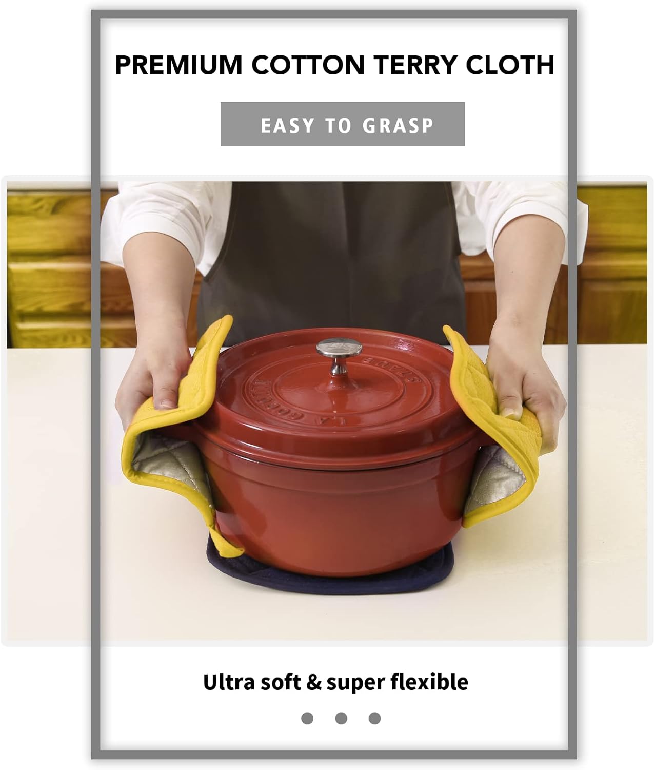 - QUILTED AND PADDED - Heat resistant up to 400 degrees allowing safe removal of baking dishes and cast iron from the oven and hot pots from the stove.