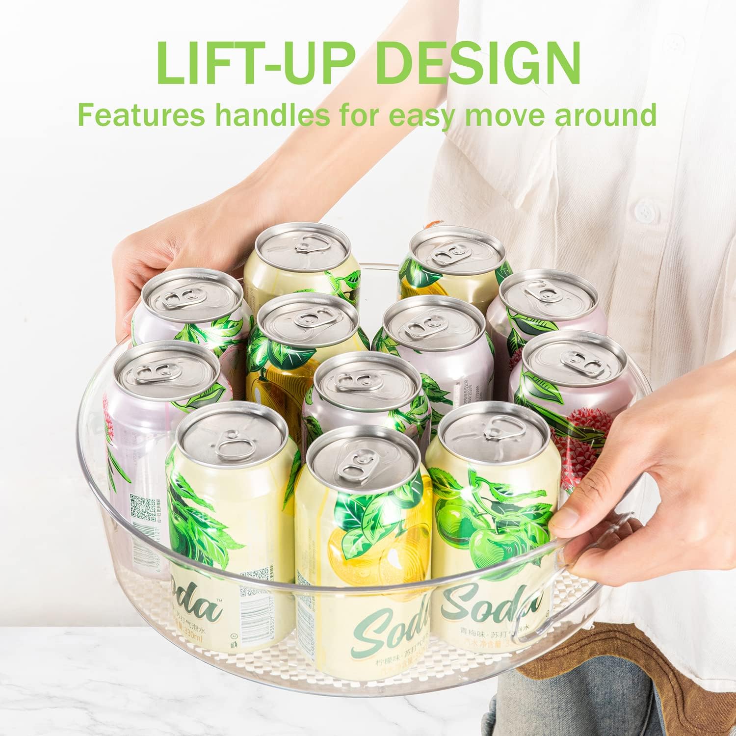 - LIFT-UP HANDLES & DEEP RIM - This lazy susan spinner is built-in features handles for easy gripping and moving around. The extra raised edge prevent items from tipping over while spinning. Sturdy, durable, and great clear quality plastic design matches your modern home style