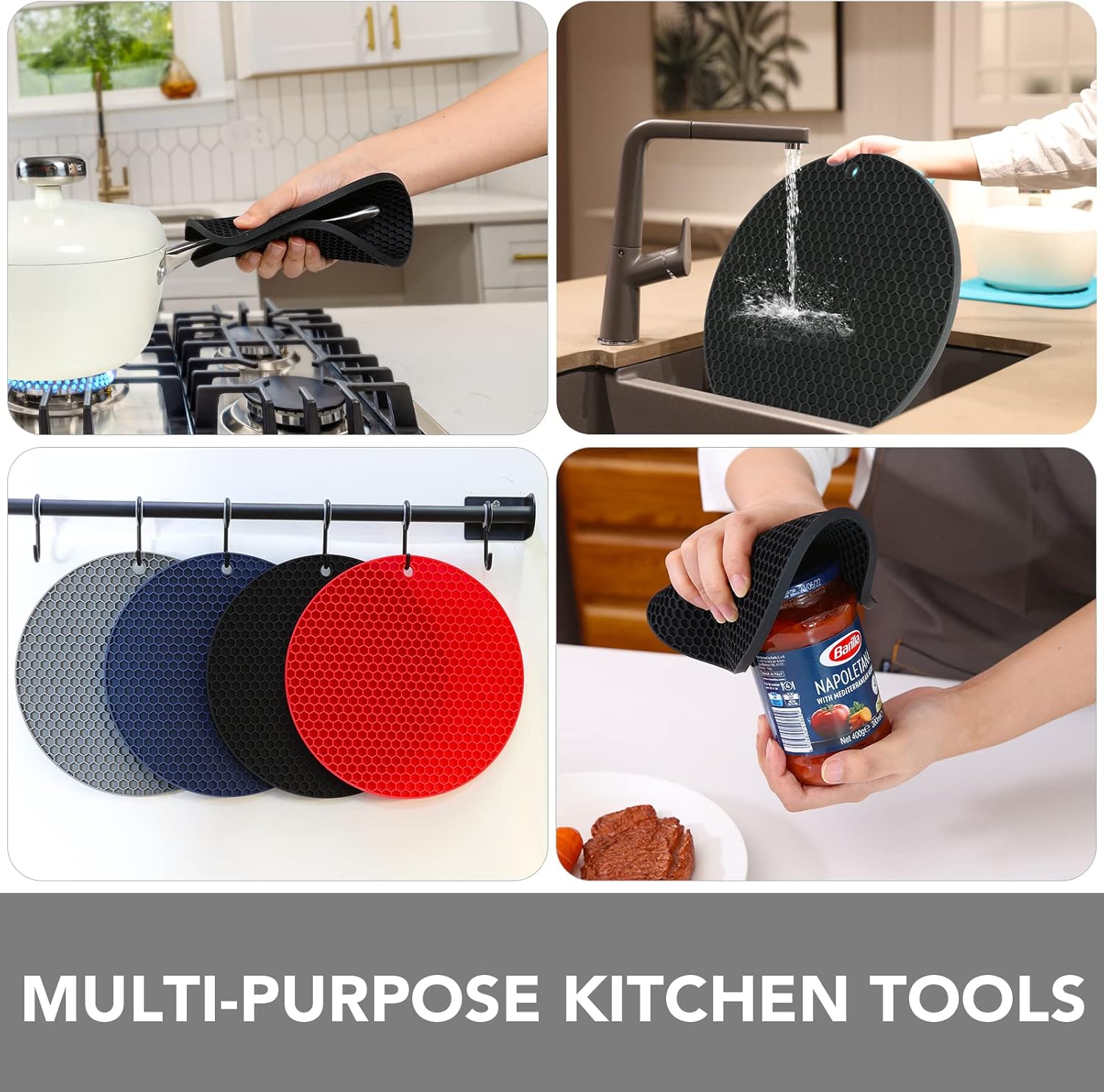 - MULTI-PURPOSE KITCHEN TOOLS - Each trivet has a corner hole for convenient hanging storage and can be used as a coaster, drying mat, jar opener gripper pad, spoon holder, garlic peeler, and potholder mat.