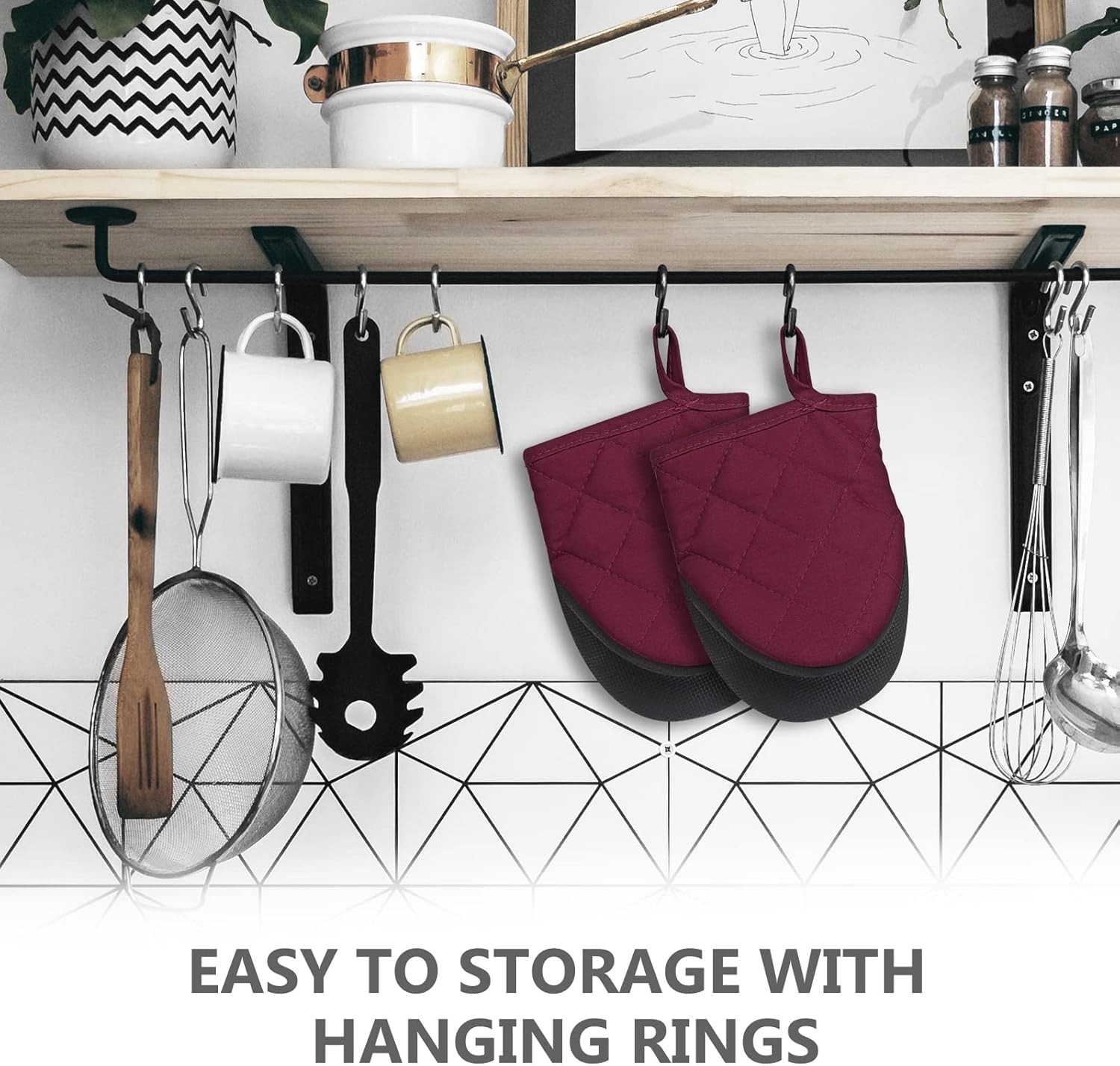 - 【Easy Clean & Storage】- If you get any food on them while wearing, just gently swish around in soapy water or just wipe them clean. Both the surface of silicone and inner lining can be cleaned. You can hang it up with the nice hanging hook in the cuffs.
