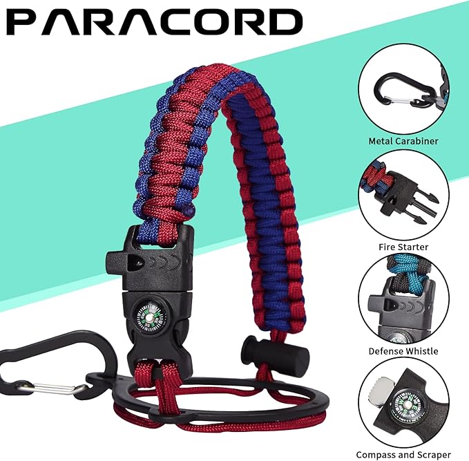 • UNIQUE DESIGNS PARACORD HANDLE: Full-function paracord handle made in individual styles to match the color of the flask water bottles. With compass, safety ring, carabiner, flint fire starter & whistle. It unravels into a sturdy and taut rope in an emergency, making the large water jug an ideal survival kit for expeditions in the wild