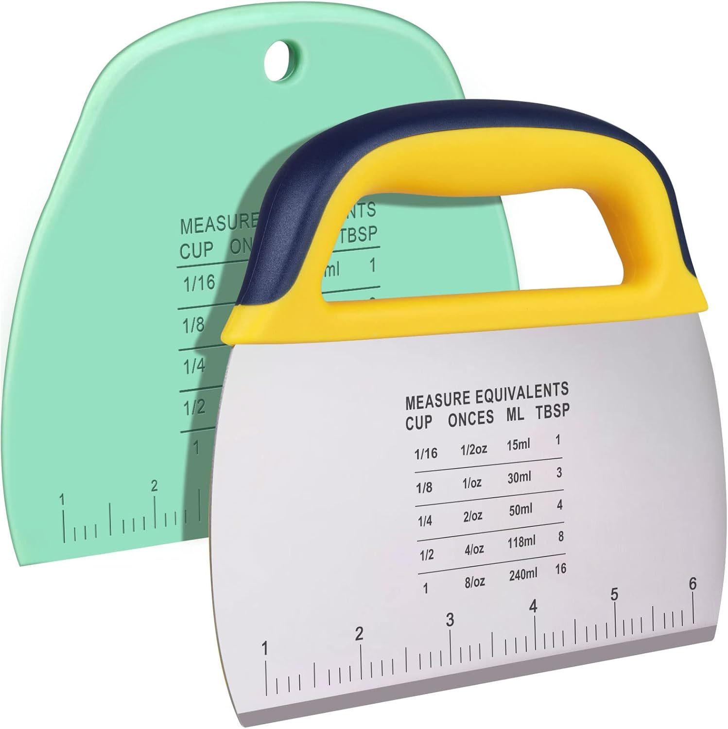 - CONVENIENT MEASUREMENT Both bench scrapers are engraved with easy-to-read measurement scales and conversion charts. The ruler lines on the bottom edge that measures up to 6 inches, makes it easy to cut pastry in the same size. The conversion chart will save you time looking conversions up in cookbooks or online (cup=fl oz=tbsp=ml).