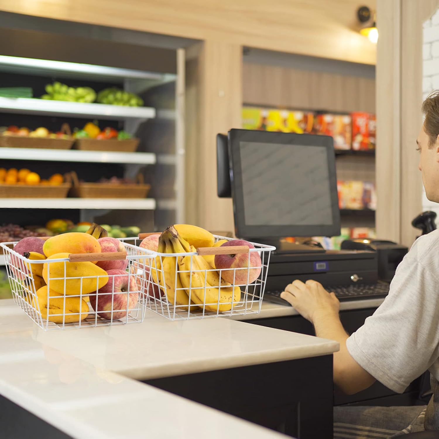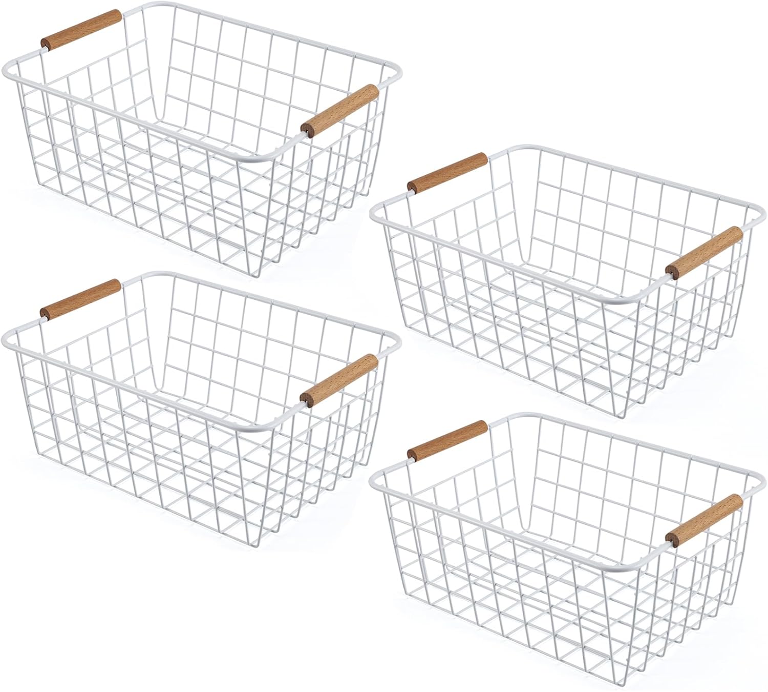 Wire Basket 4 Pcs Wire Storage Baskets Wire Baskets Organizing with Wooden Handles Wire Basket Pantry Organization and Storage Metal Wire Food Storage Basket for Kitchen, Cabinets (White 4PCS)