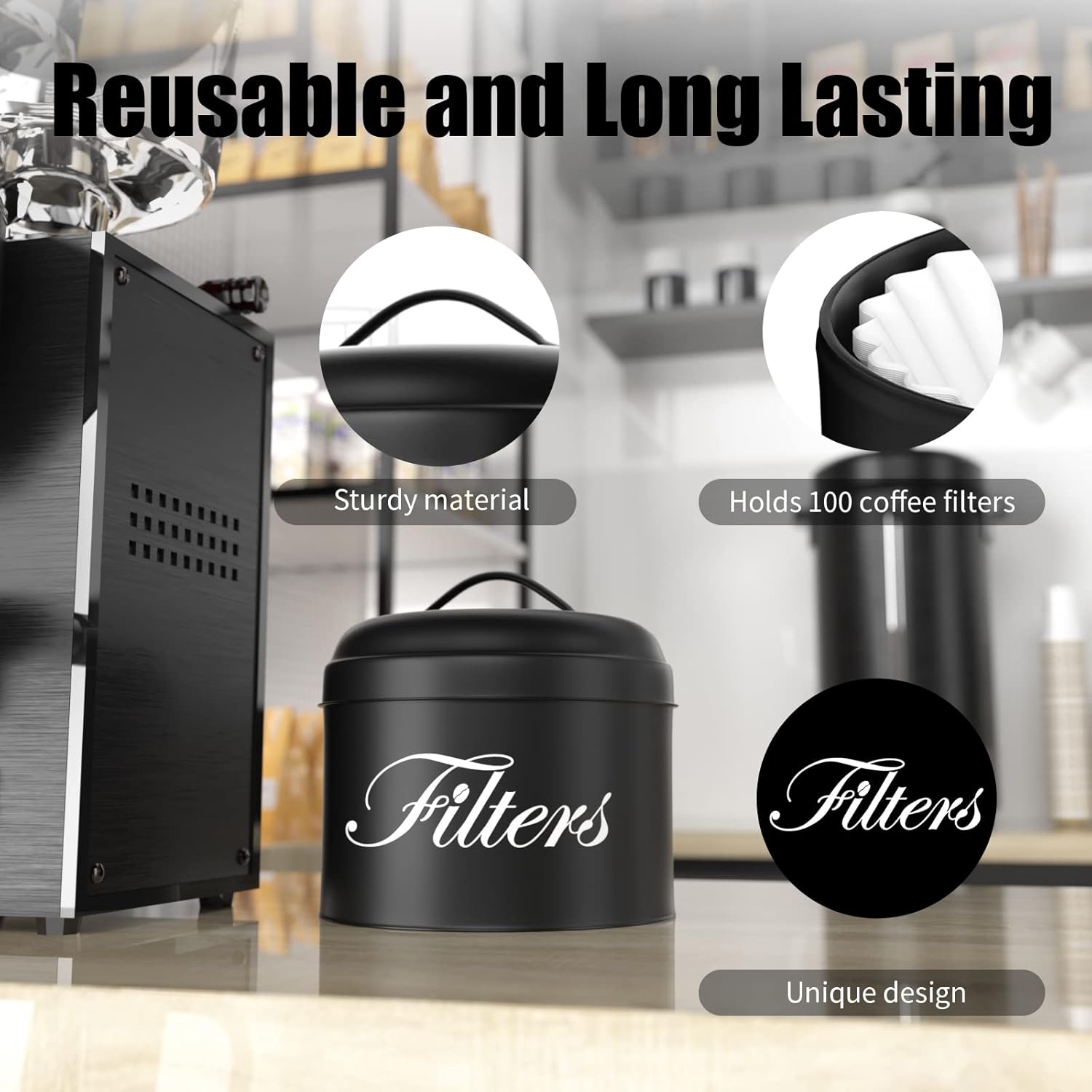 - COFFEE FILTER CONTAINER : Our coffee filter holder storage made of powder-coated galvanized steel, not easy to break and deform, which can provide you a comfortable service for a long time. The smooth interior and surface are very easy to clean, just wipe with a damp cloth. Comes with a lid to keep the filter away from dust, moisture and other clutter