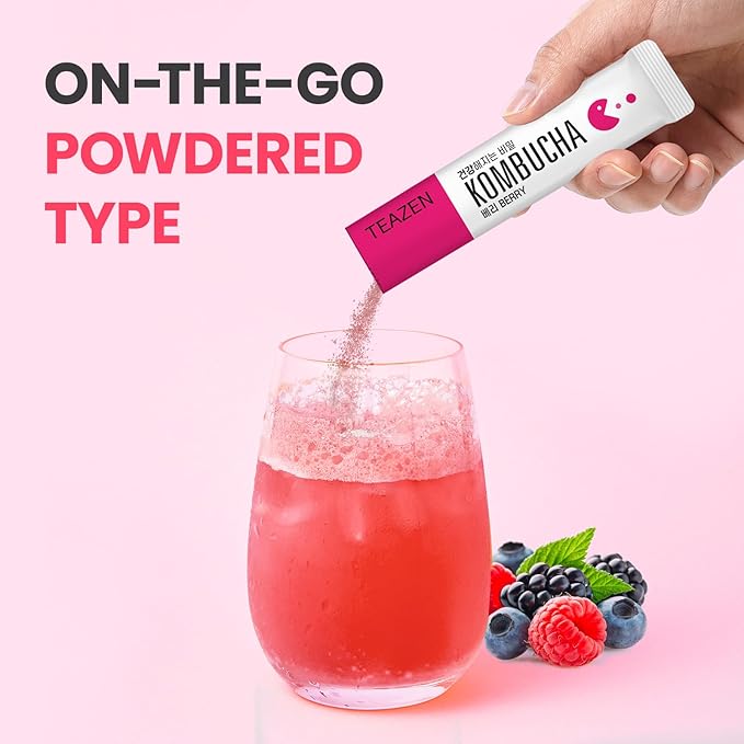 TEAZEN Berry Kombucha Tea, Hydration Drink Mix, Sugar Free, Live Probiotics & Prebiotics, 30 Sticks, 5.29oz