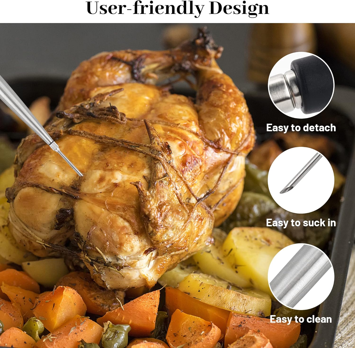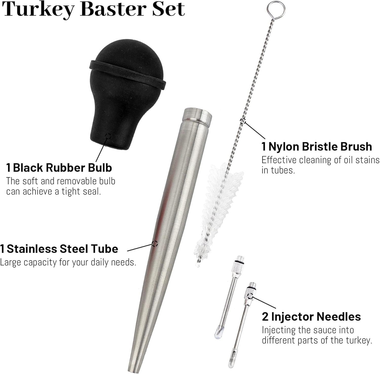 - Turkey Baster Set: The turkey baster set contains 1 bulb, 1 stainless steel tube, 1 cleaning brush, and 2 different turkey injector needles for flavor, it's a good kitchen assistant for your next Thanksgiving or Christmas dinner.