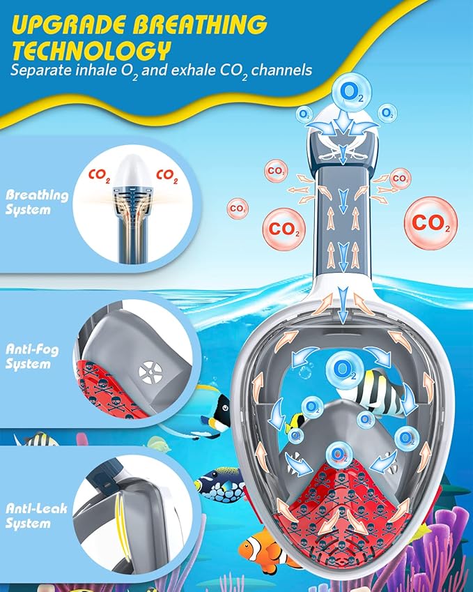 • 【Full Face Snokel Mask For Kids】Be made of hard PC, snorkel mask kids anti fog is non-toxic and odourless; wrapped by soft and thick silicone, it protects your safety and won’t make you headache for longtime wearing; free breath, full face design allows you to breath comfortably through nose and mouth during snorkeling it's safe for kids to use.