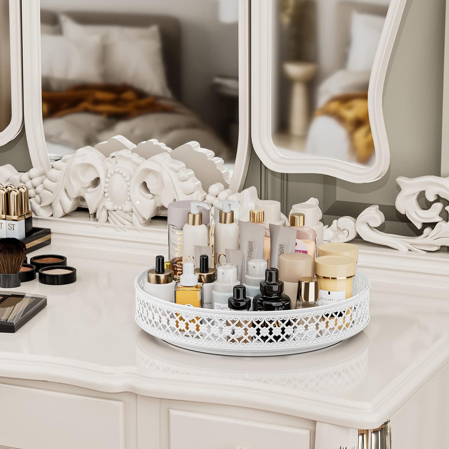 - Floral Raised Edges:The heightened edges with beautiful classic floral design . not only provide a special decorative vision but also avoid items from falling when rotating , it's more safe to move this organizer tray from one place to another . Open design make the items visible and easy to access. If you have any questions, please feel free to contact us, Ovicar will provide 100% satisfaction after service.