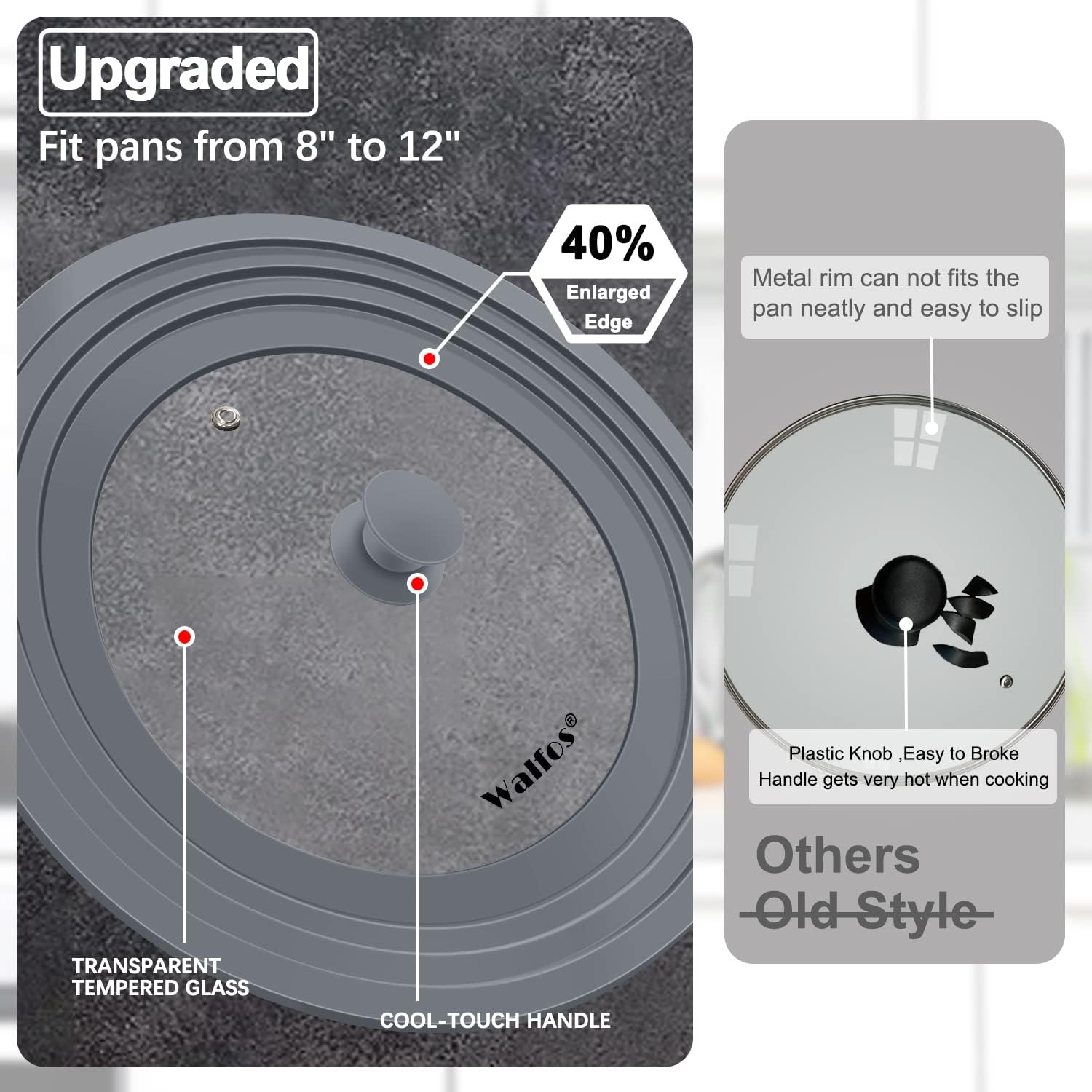 Universal Lid for Pots, Pans and Skillets - Walfos Tempered Glass Pan Lid with Heat Resistant Silicone Rim, BPA Free Large Pot Lids Fits 8" to 12" Diameter Cookware, Dishwasher-Safe, Grey