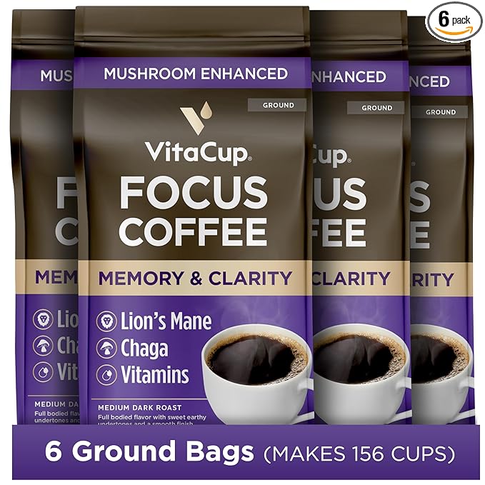 VitaCup Focus Mushroom Coffee Grounds, with Lions Mane, Chaga, B Vitamins, D3, Boost Focus, Immunity, Memory & Clarity, Medium Dark Roast, Bold & Smooth 100% Arabica Specialty, 6 bags, 10oz each