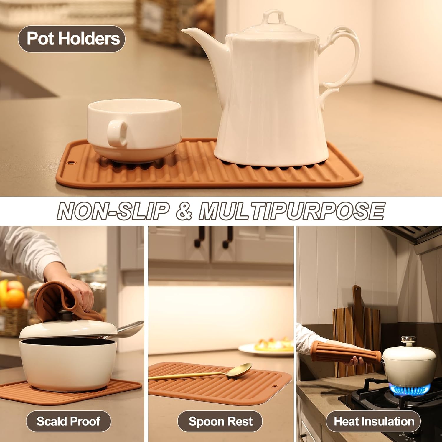 - MULTIPURPOSE KITCHEN TOOLS - Our silicone trivets for hot dishes are non-slip, flexible and soft enough to comfortably grab hot pots and pans, jar opener, drying mat or potholders. Silicone hot pads for kitchen are perfect for use in an oven, microwave, or freezer, protect your hands from hot and cold.