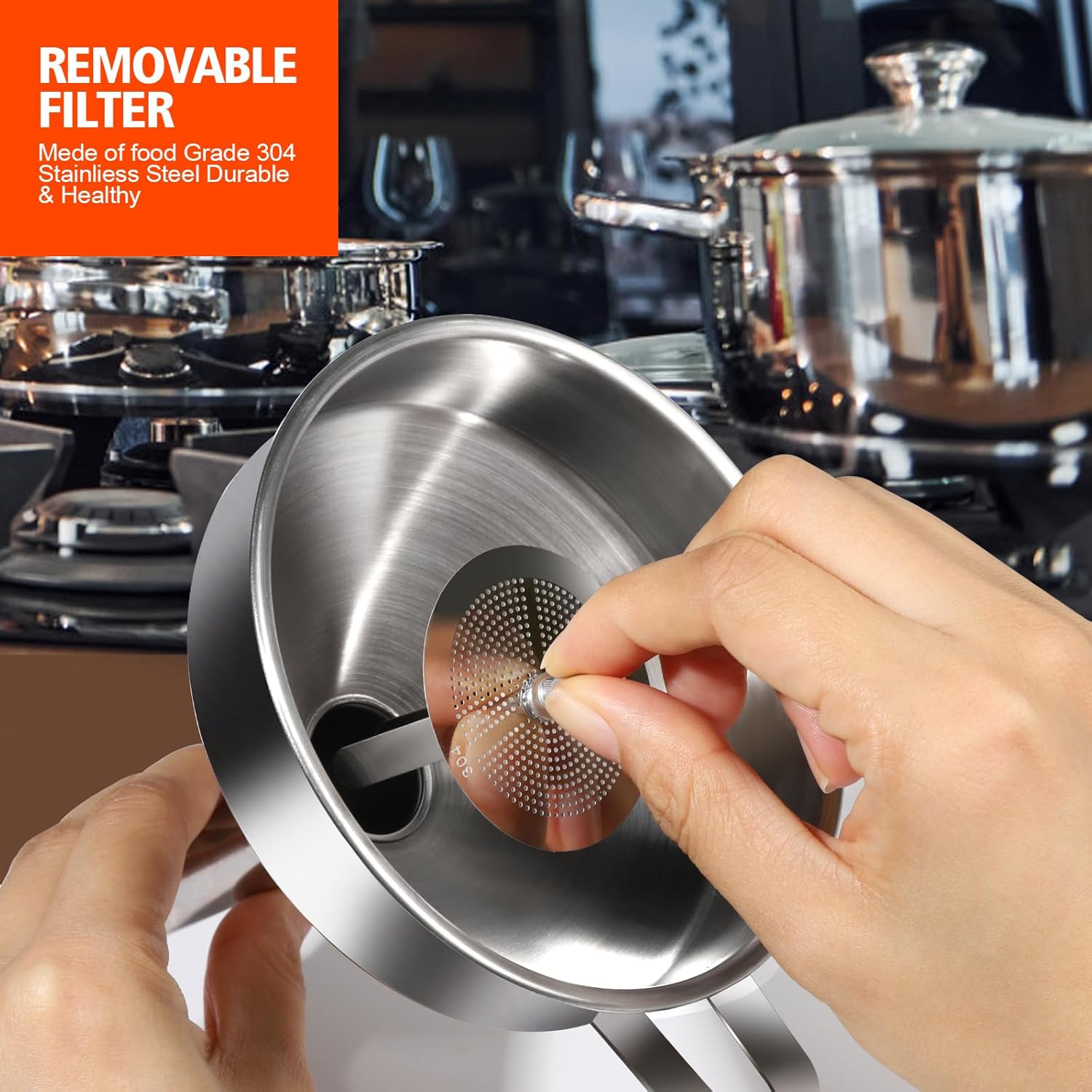 - Funnels for Kitchen Use: Comes 3pcs kitchen funnels (large, medium, small) , plus 3pcs Removable Strainer & 2pcs funnel cleaning brushes, great LARGE funnels for filling bottles and kitchen use. Large stainless steel funnel with handle and filter, with large deep-sided capacity and wide mouth for fast filling.