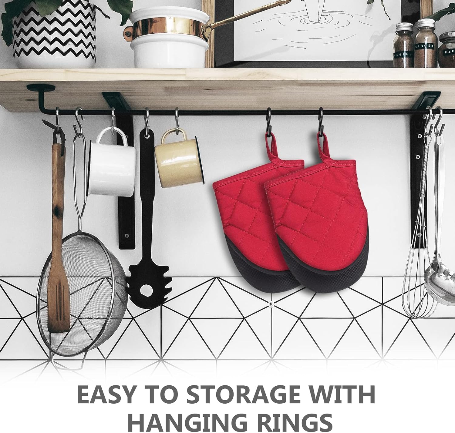 - 【Easy Clean & Storage】- If you get any food on them while wearing, just gently swish around in soapy water or just wipe them clean. Both the surface of silicone and inner lining can be cleaned. You can hang it up with the nice hanging hook in the cuffs.