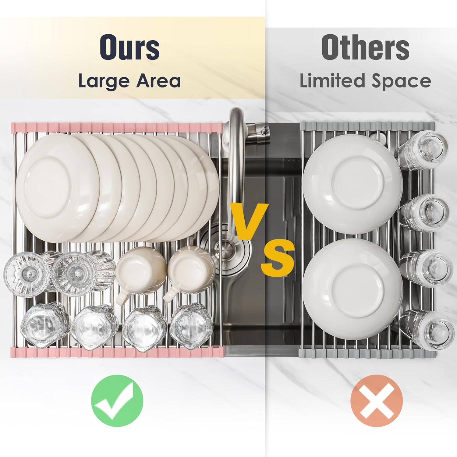 - [Multipurpose Drying Rack] - Perfect for air-drying kitchenware such as dishes, mugs, bowls, pans, glasses, cups, plates, cookware, cutlery, saucepans, bottles, and even fruits and vegetables. A must-have kitchen gadget.
