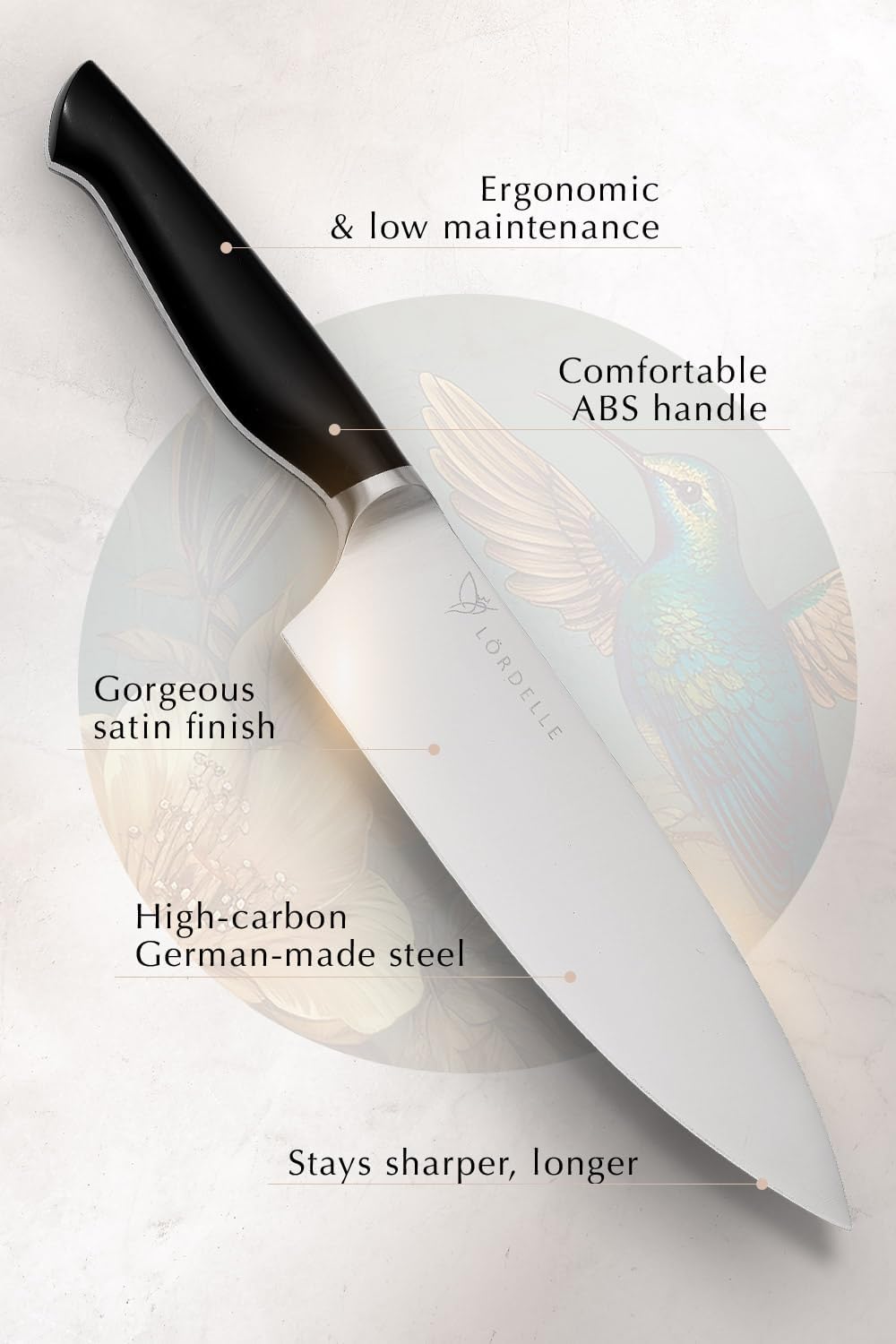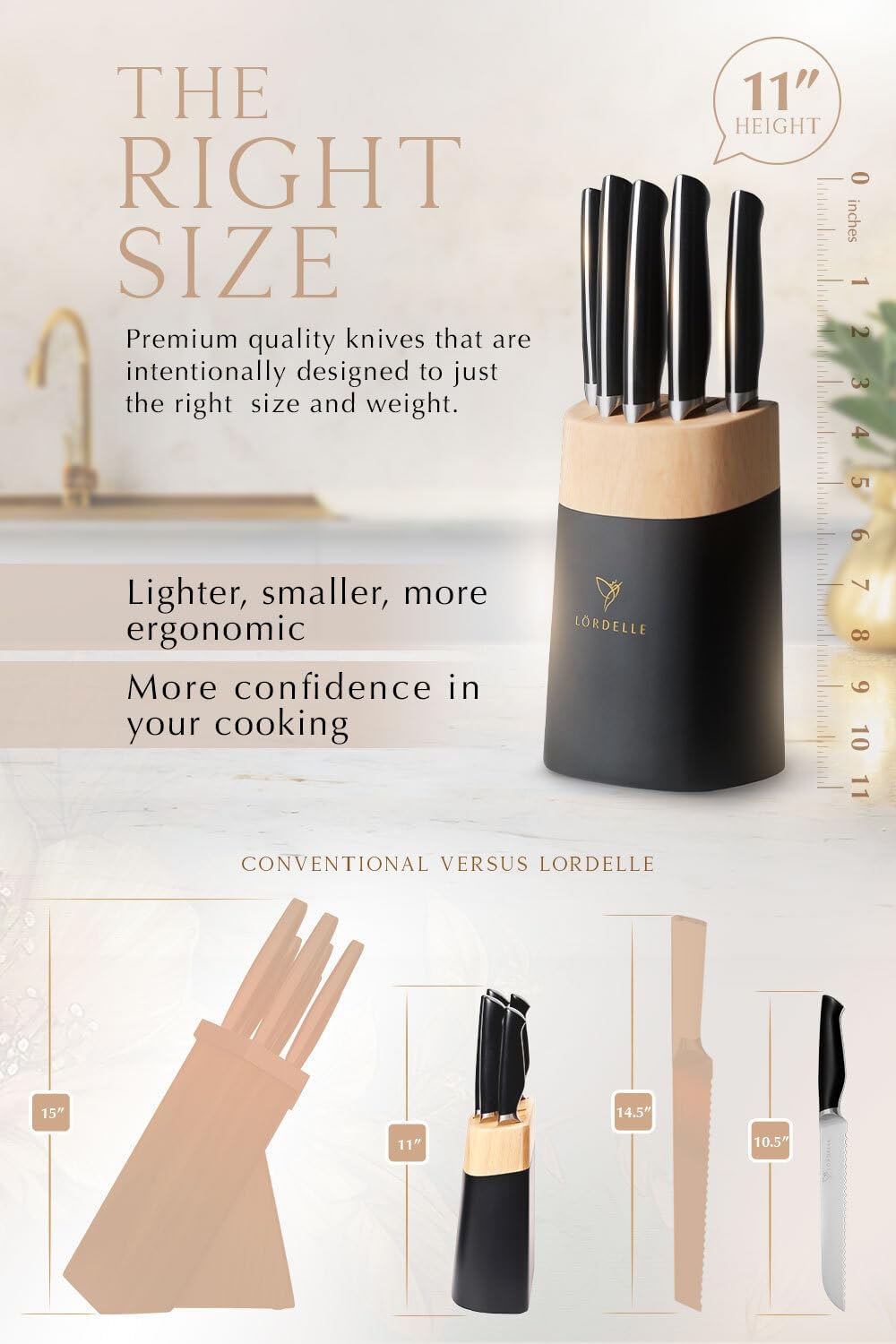 - Stunning Design Meets Comfort & Function: Discover the perfect blend of style and utility with Lordelle's "Right Size" concept. Smaller, ergonomically designed knives and a compact block that enhance both your cooking and kitchen décor, without taking up too much space.