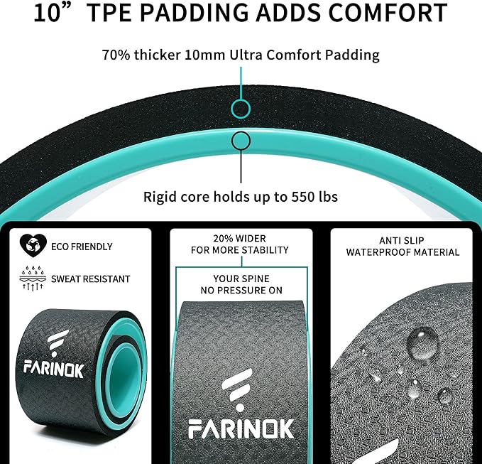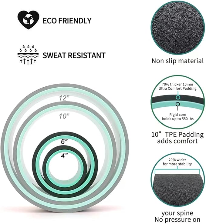 • 10MM Thick Premium Padding: Made of high-density eco-friendly TPE. Our wheels feature the thickest foam padding available to provide a soft, comfortable surface to cushion your back, palms or feet. Surface technology can resist water and sweat, easy to clean, and have better anti-slip effect. The strong rigid core made of ABS can support up to 500 lbs for extra toughness.