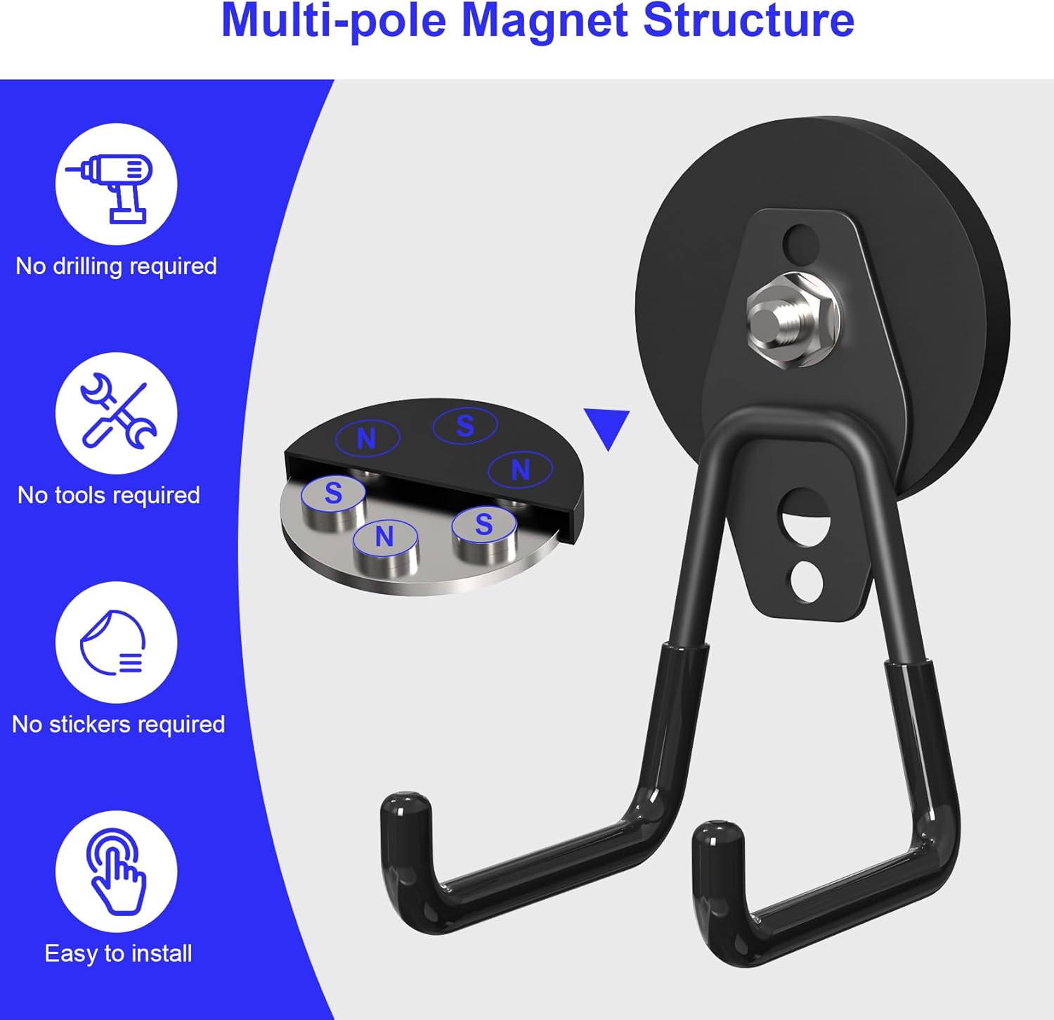 - 2 installation options available:For magnetic hooks,No need to use any tools, no need to drill, no need to install a hook.Of course, we also offer a second option. When you need to store heavier tools, we are equipped with screws that you can punch and install on any wall surface.