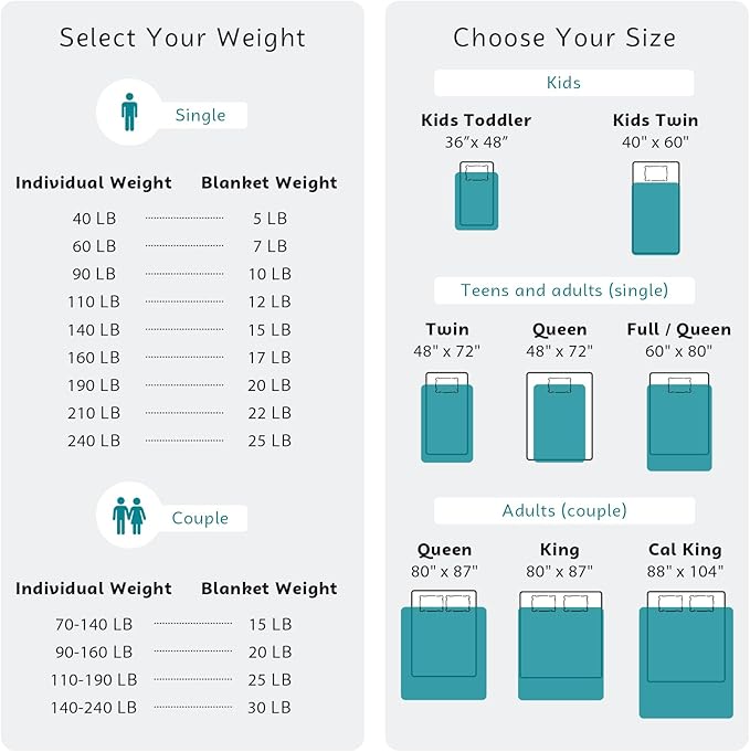 • Recommended Weight Size: Please choose 7%-12% of your body weight which would help you sleep better. We recommend 48''x72'' for twin bed, 60''x80'' for queen bed. This weighted throw blanket can be used while sleeping, reading, relaxing, or meditating