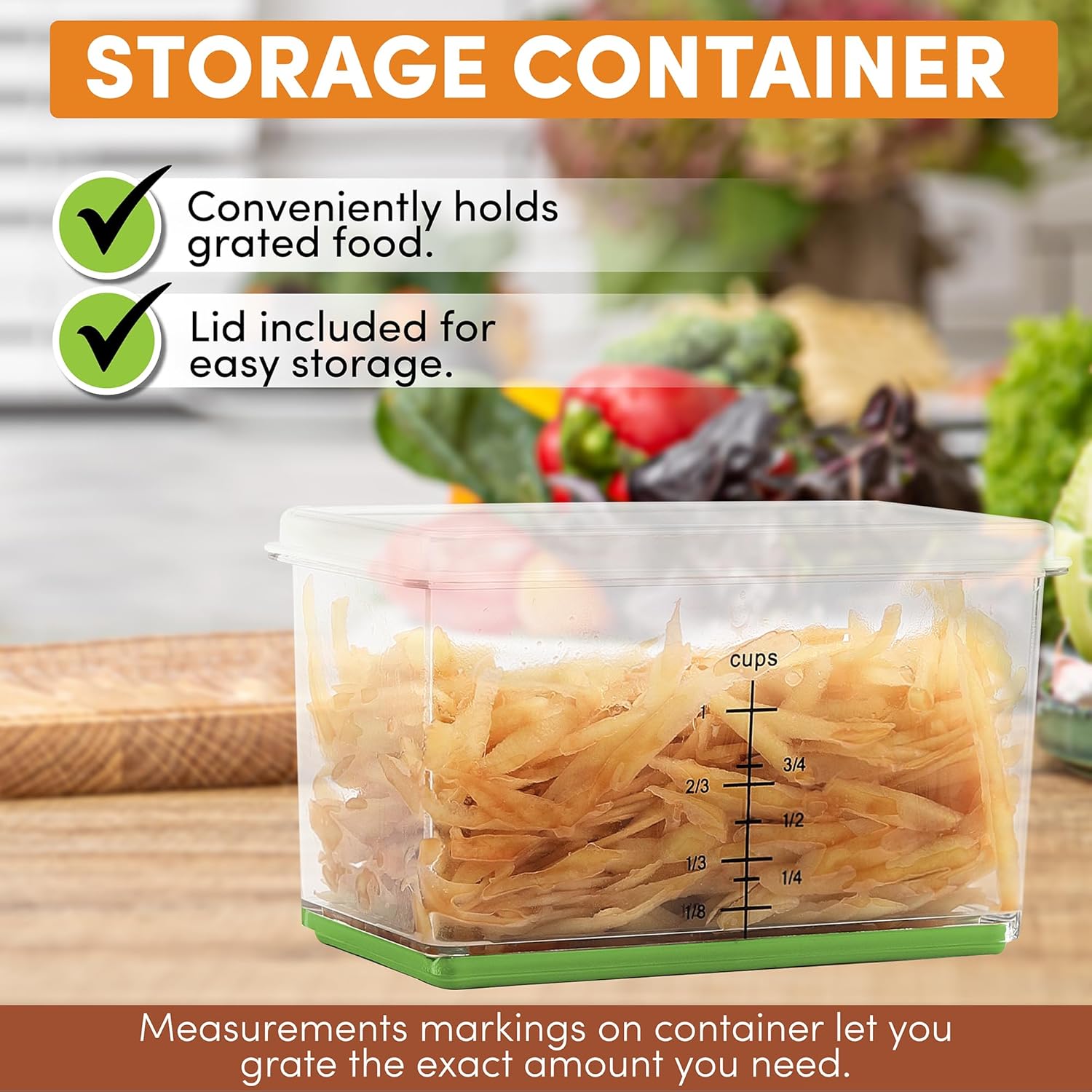 - Included Storage Container With Lid: The included storage box lets you grate directly into the container and store it with the lid. The container also has measurement markings on the side so you can get the perfect amount.