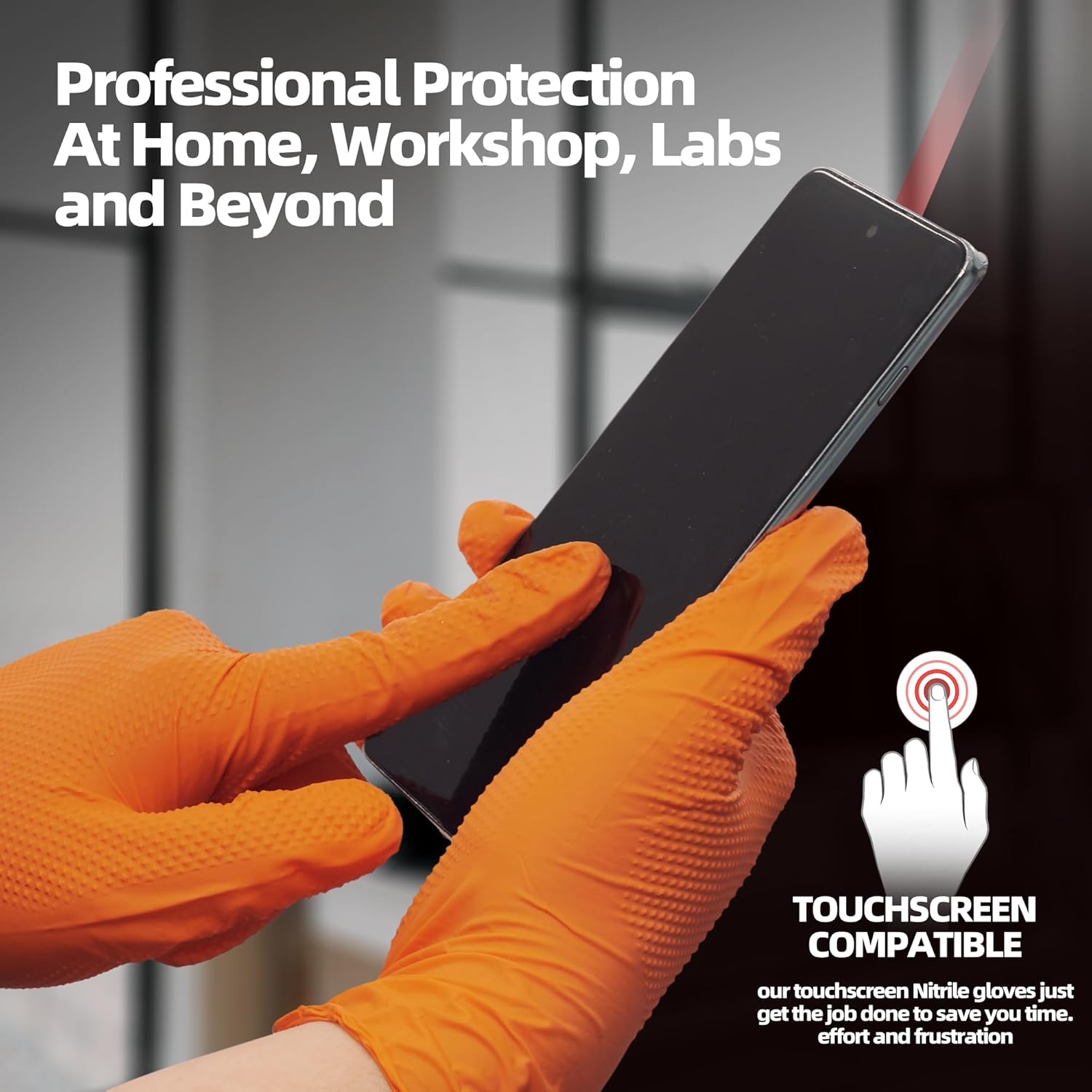 - High Visibility: The vibrant orange nitrile gloves enhance visibility in dimly lit environments, significantly improving safety during heavy-duty tasks in mechanics, automotive, construction, and manufacturing industries