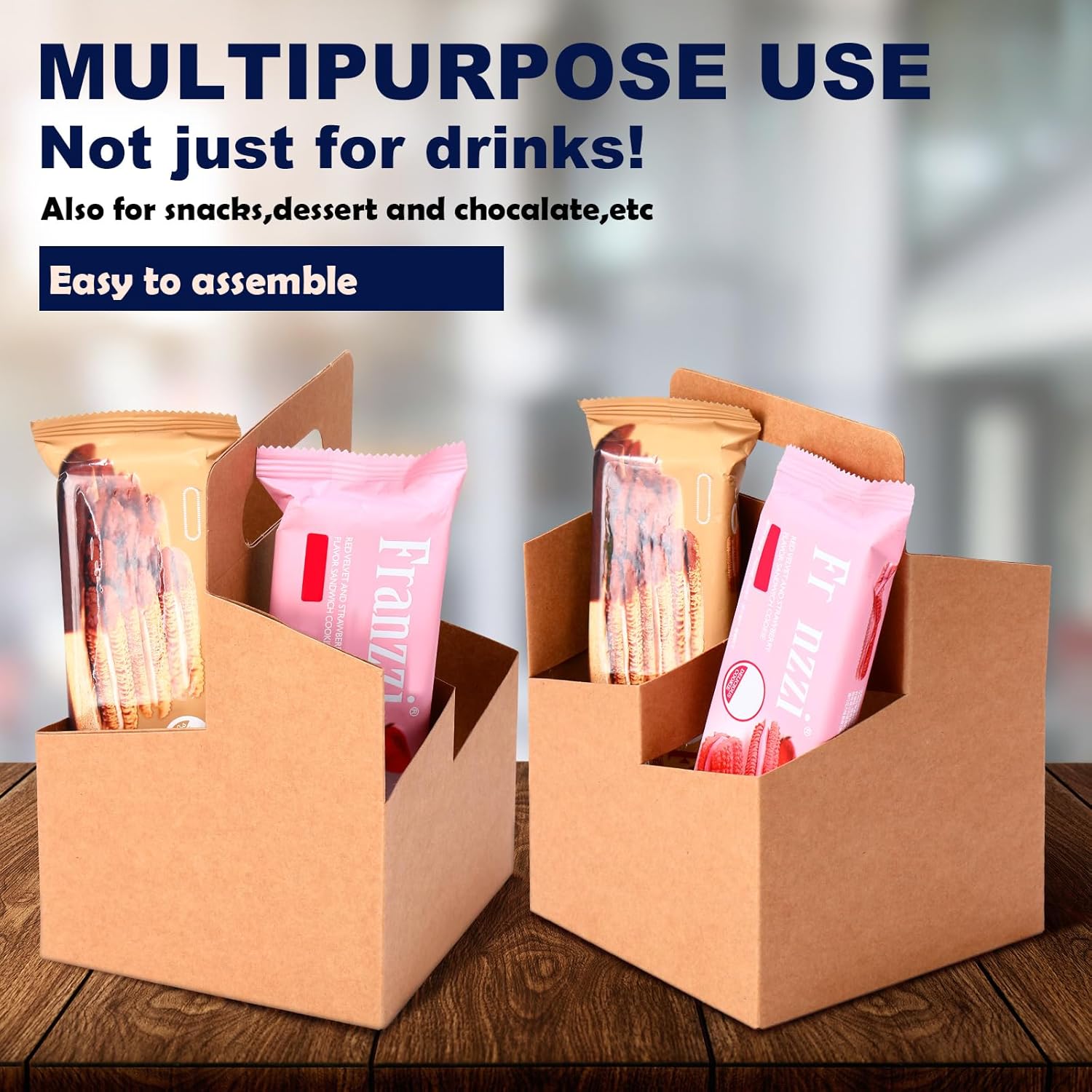 Jetec 4 Cup Drink Carrier with Handle, Kraft Paperboard Beer Carrier, Disposable Drink Holder for Hot or Cold Drinks, 12-16 oz Bottle Holder for Soda and Other Bottled Products(50 Pcs,Brown)