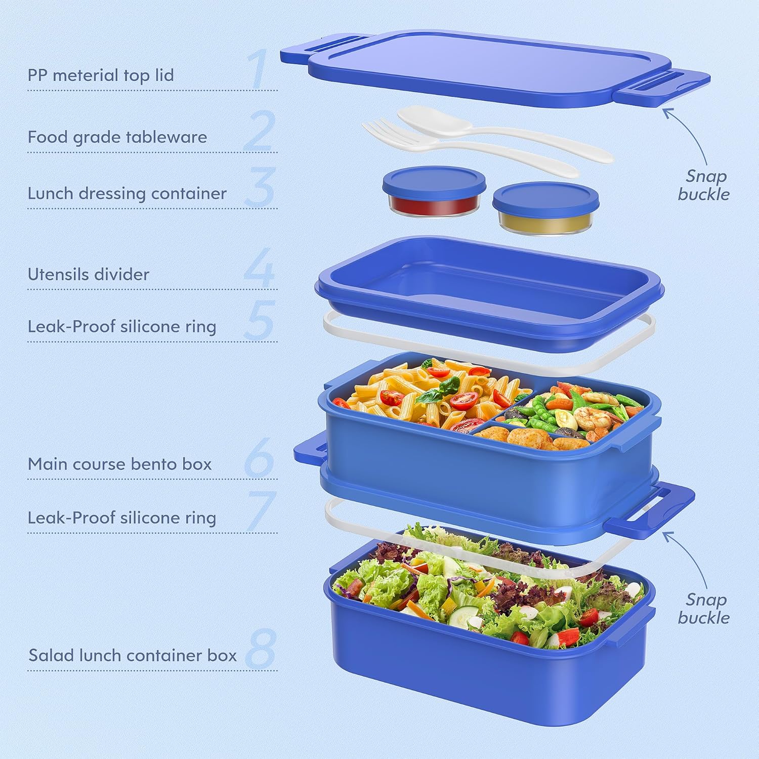 Jelife Adult Bento Lunch Box - 3 Layers Stackable Bento Lunch Box for Adults, 72oz Large All-in-One Bento Box Leak-Proof Lunch boxes with Utensil Sauce Containers, Ideal for Dining Out,Work, Blue