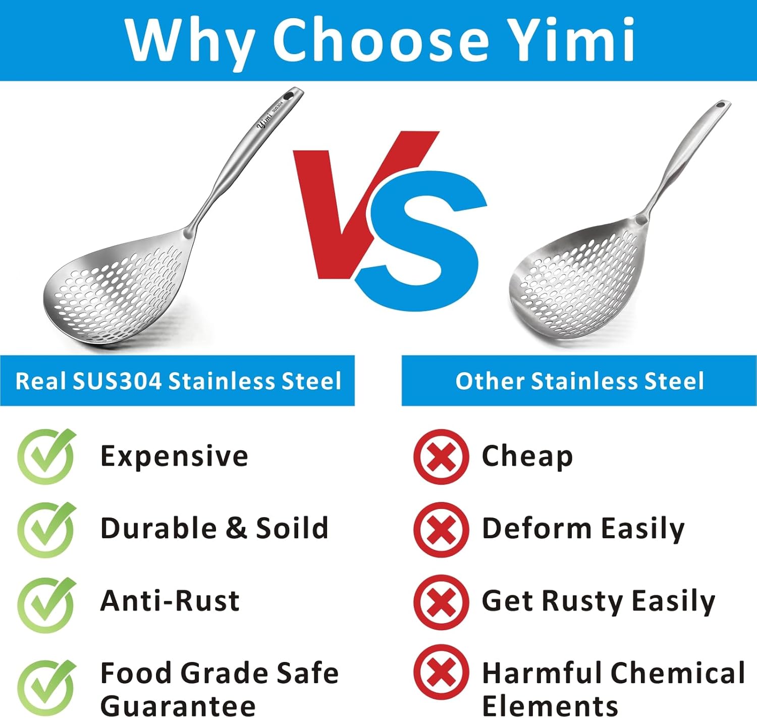 - REAL SUS304 FOOD GRADE STAINLESS STEEL - Compared to other stainless steel which includes harmful chemical elements, SUS 304 stainless steel is more durable and safe, heat resistant, corrosion resistant, BPA free, chemical free, but more expensive.You can use it to cook for baby without any worry. (SUS304 logo is on the handle)