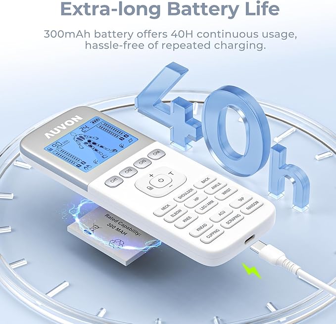 • Bigger Battery, 2X Battery Life. No worries about usage interruption for dead AAA batteries any more! It has a 300mAh rechargeable battery to last up to 40h standby time, which beats other TENS with 180mAh by 20h. (Charge it with your wall charger, power bank or laptop using the included Type-C cable)